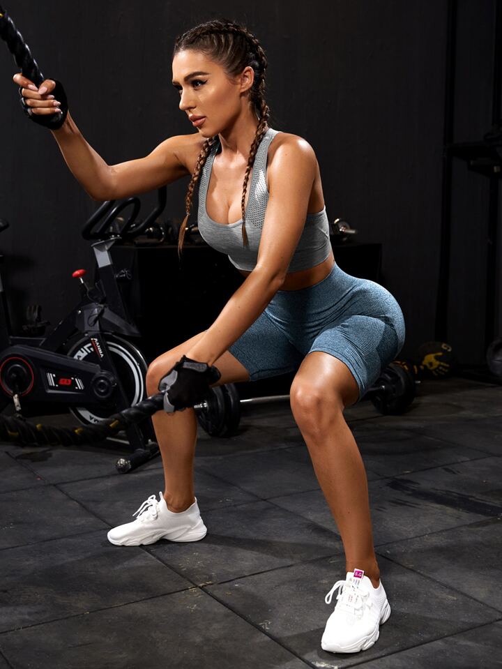 2 pezzi Completo fitness da palestra senza cuciture in maglia marled Reggiseno incrociato & Pantaloncini da motociclista con cintura larga