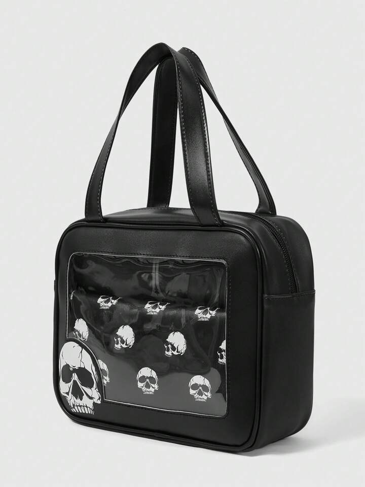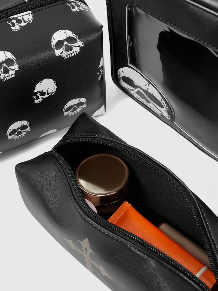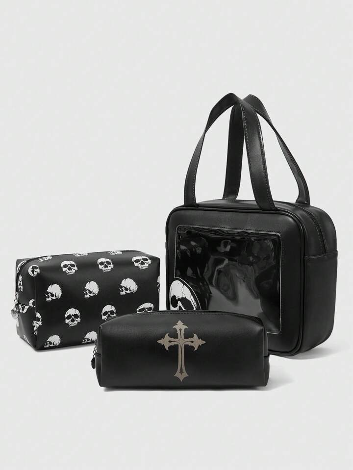 Goth Set di 3 borsette portatili nere con stampa gotica a teschio