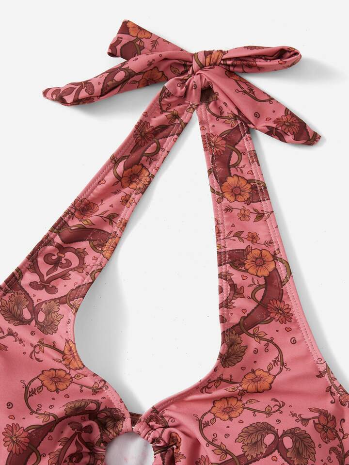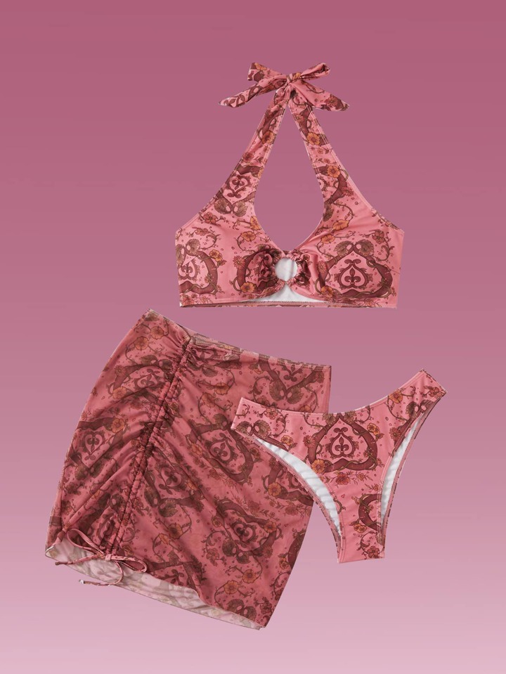 Set di 3 Bikini Halter Con Anelli Con Stampe Floreali e Gonna da Spiaggia a Coulisse