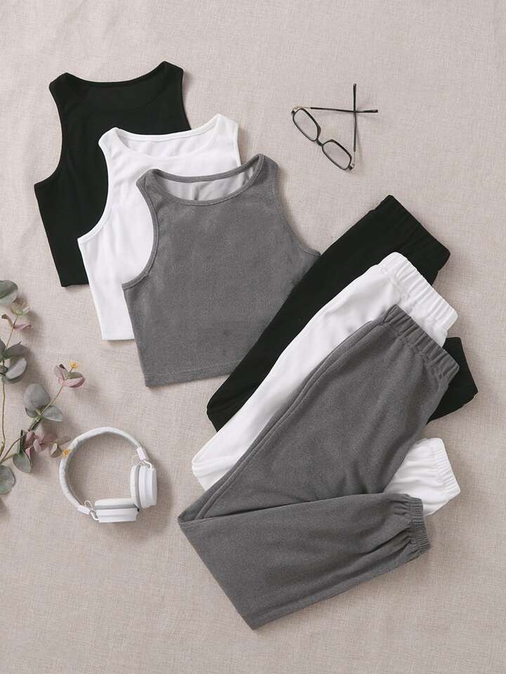 3 set di top a canottiera e pantaloni della tuta, set da abbigliamento casual