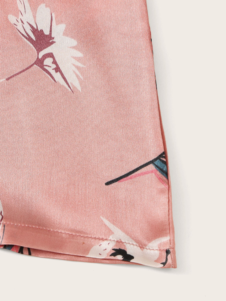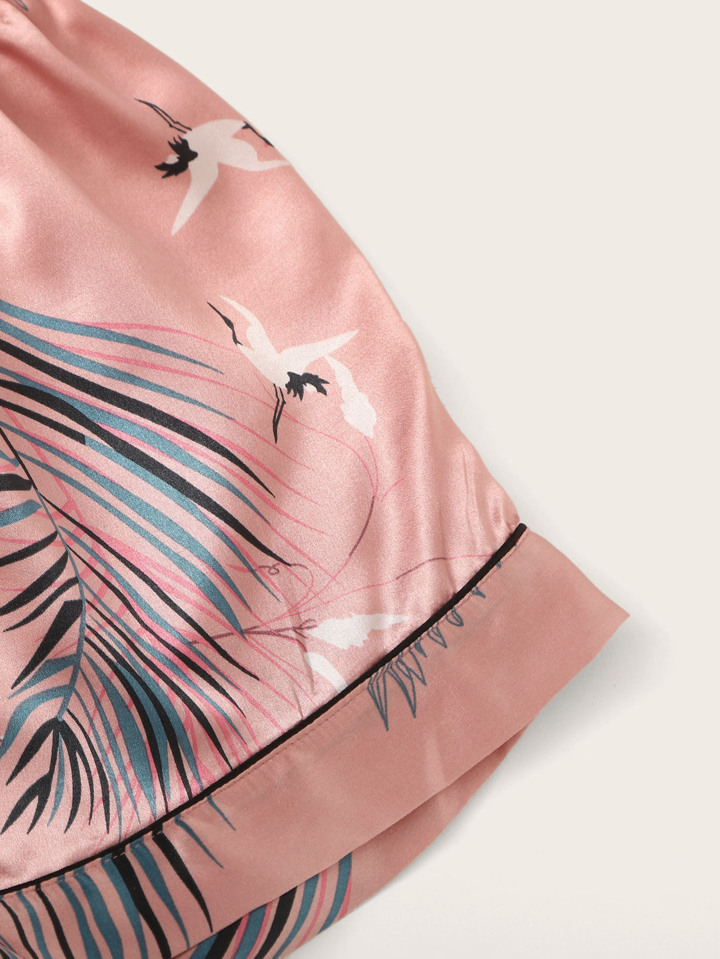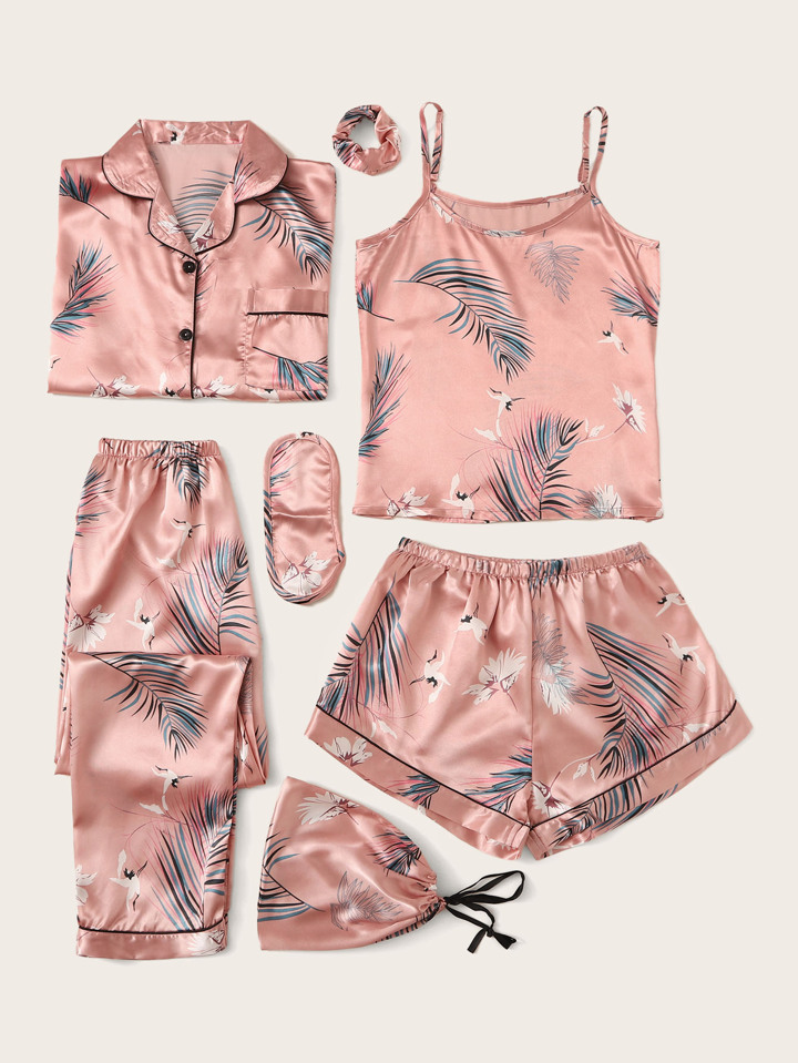 7 pezzi Set pigiama in raso con stampa di gru e tropicale, abiti autunnali e invernali, dettagli confortevoli ed eleganti