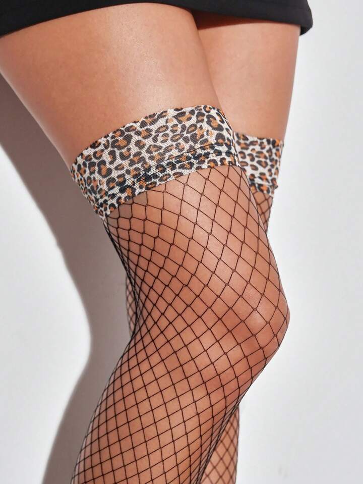 Academia 1 Paio di autoreggenti in rete con stampa leopardata, calze alte nere sopra il ginocchio, collant sottili e traslucidi che snelliscono le gambe, calze a rete nere sottili