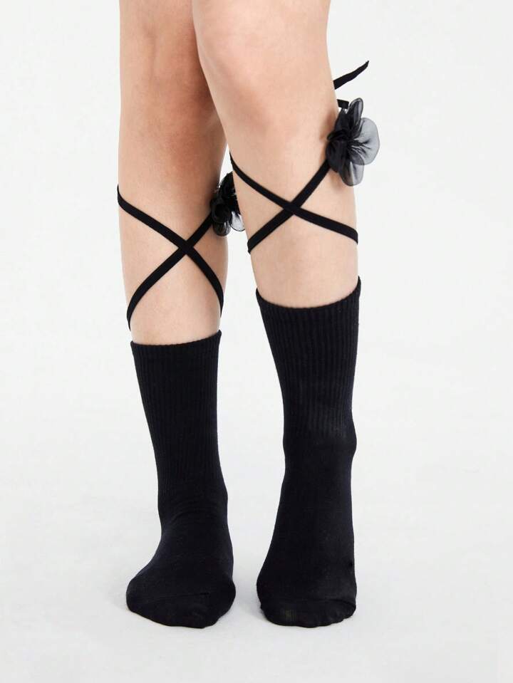 Academia 1 Coppia di calzini a mezza gamba con lacci neri e motivo floreale in maglia nera per le donne, adatti per la primavera, l'estate e l'autunno