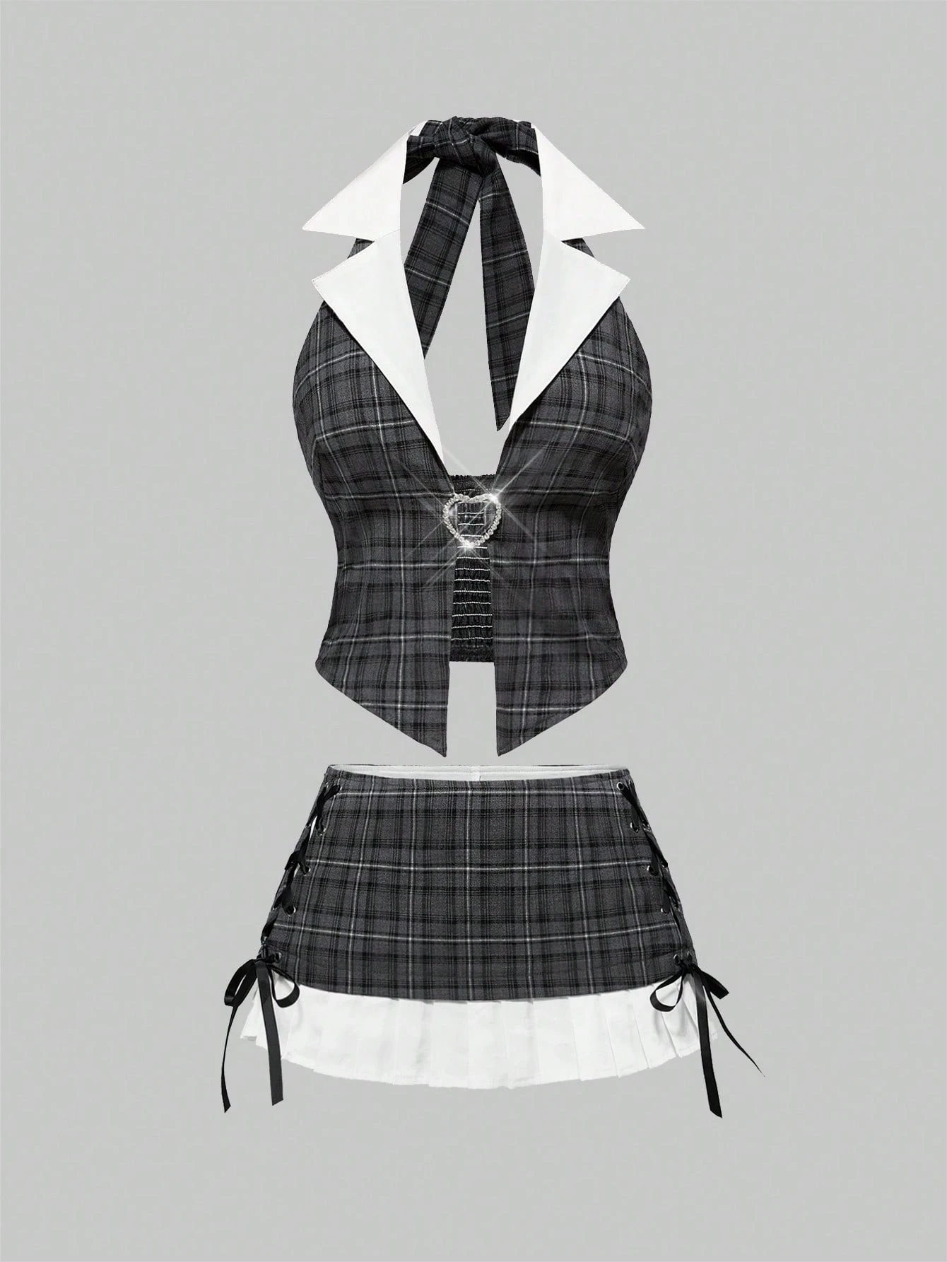Academia 2 pezzi Set di crop top e minigonna con blocchi di colore in stile Y2K per studentesse