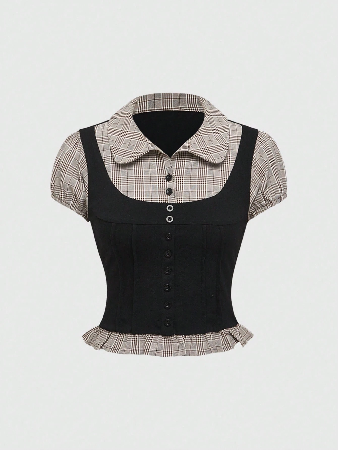 Academia Camicia da donna stile universitario, a maniche corte, con patchwork a quadri neri e grigi