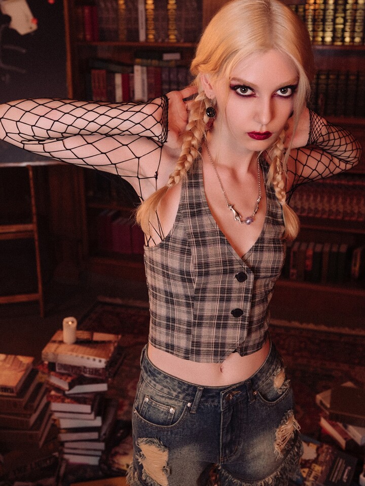 Dark Academia Top halter a quadri con bottone frontale