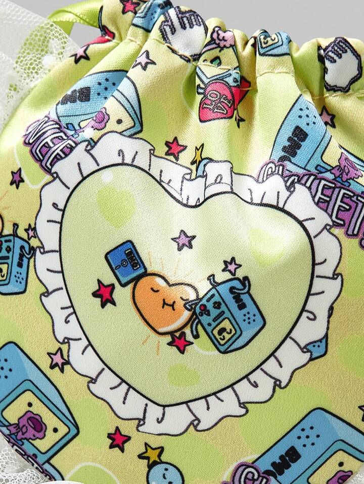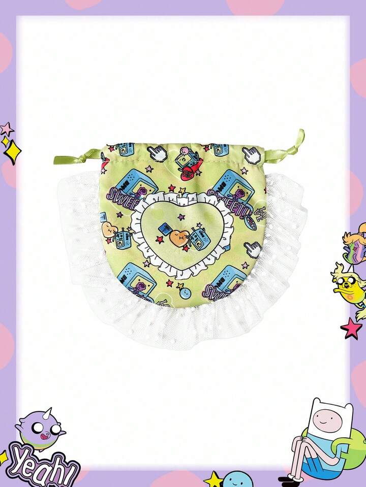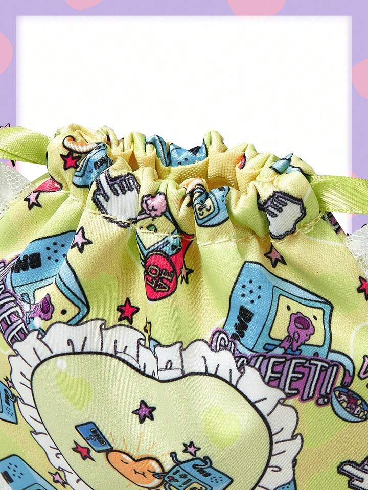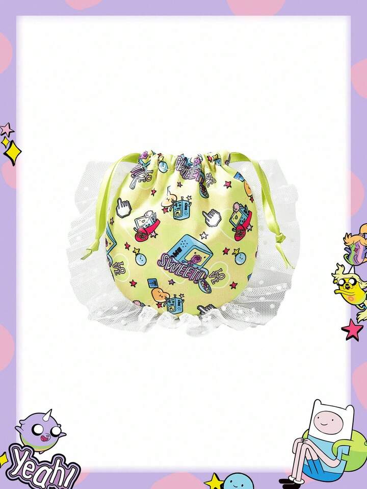 Adventure Time X ROMWE Borsa a sacca con chiusura a cordoncino, grande capacità, con stampa di cartoni animati e dettagli in pizzo in rete, organizer per cosmetici