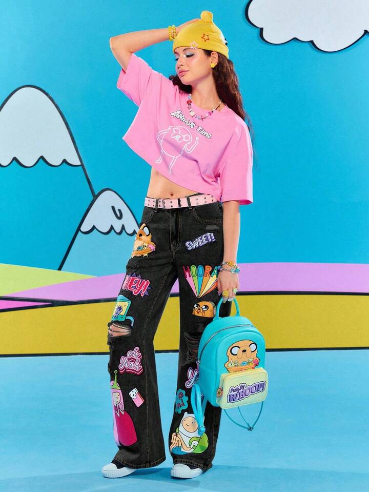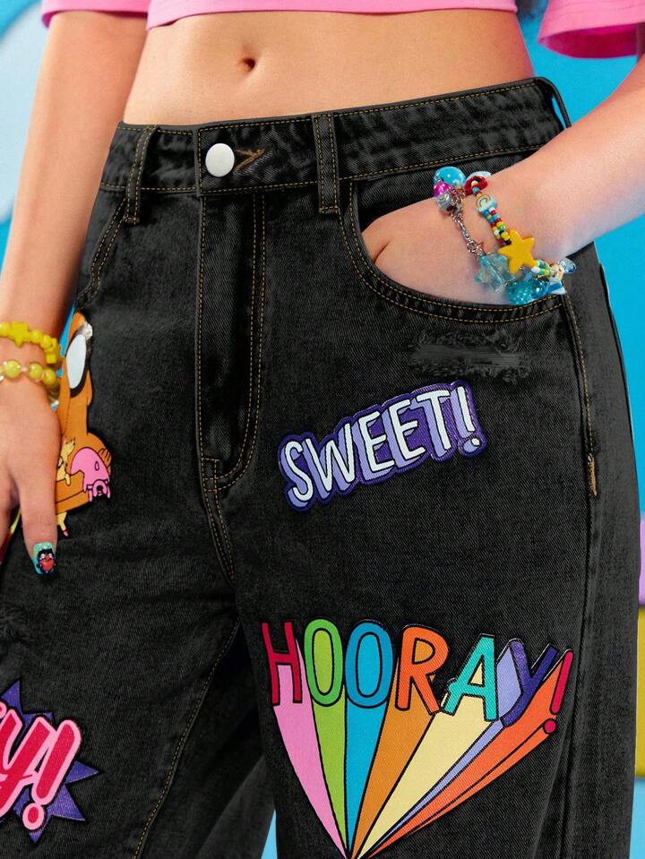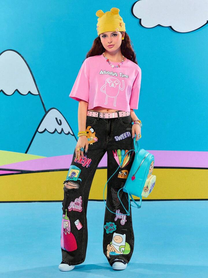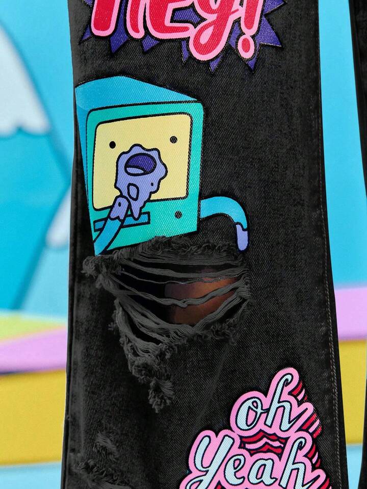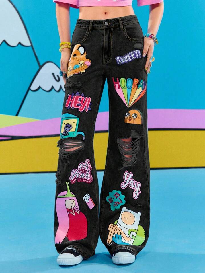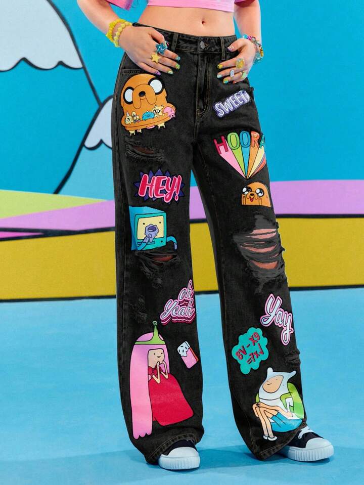 Adventure Time X ROMWE Jeans casual da donna con grafica a cartoni animati strappati e vestibilità morbida
