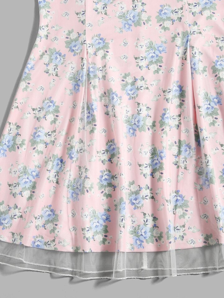 Abito con bretelle sottile stampa floreale tulle a contrasto