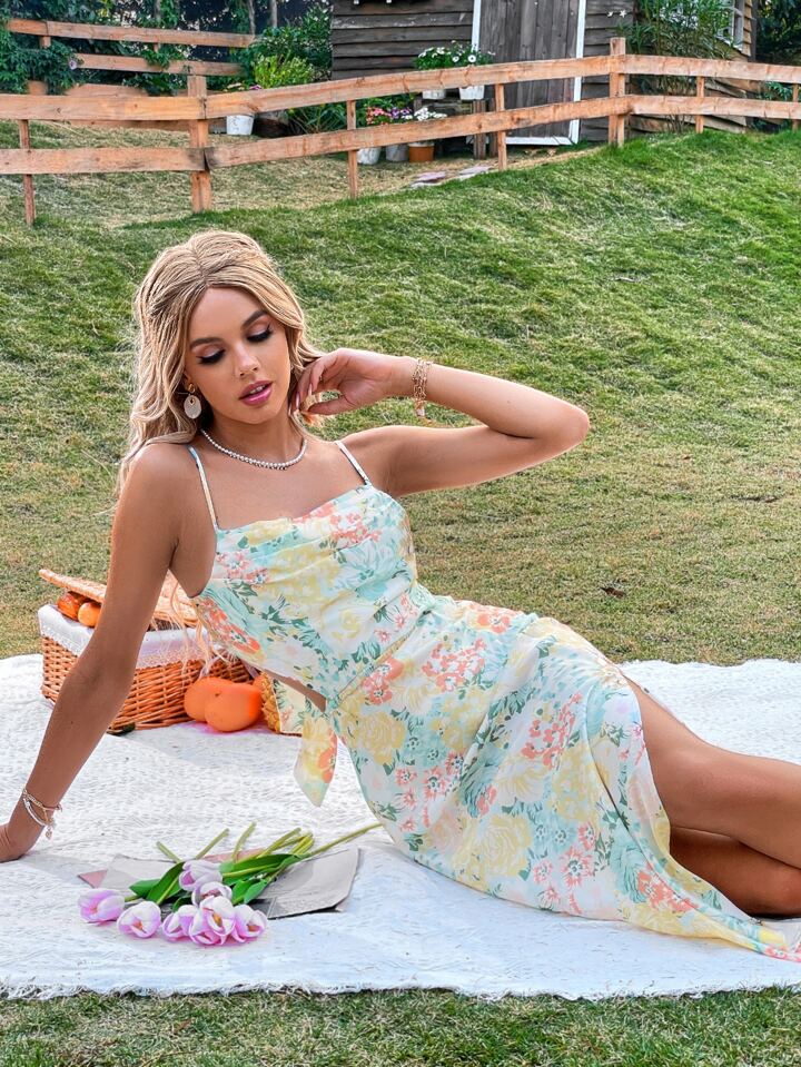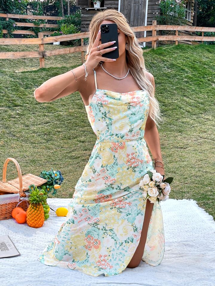 Abito con bretelle sottile stampa floreale capestro a fessura alta
