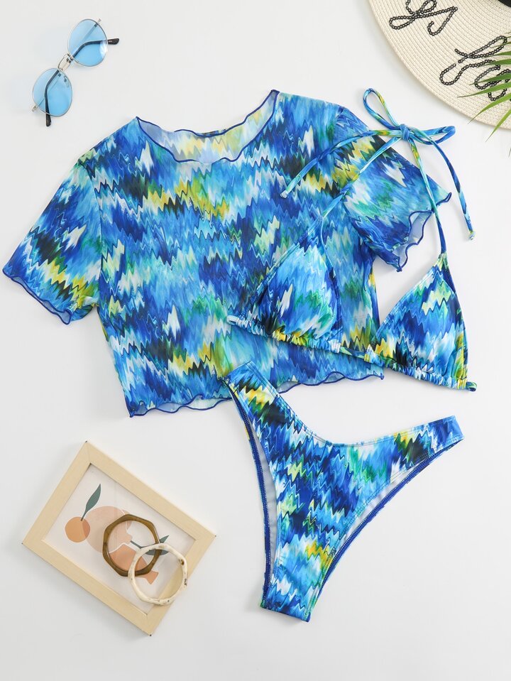 Set bikini estivo con orlo a lattuga e stampa totale con copertura per la spiaggia