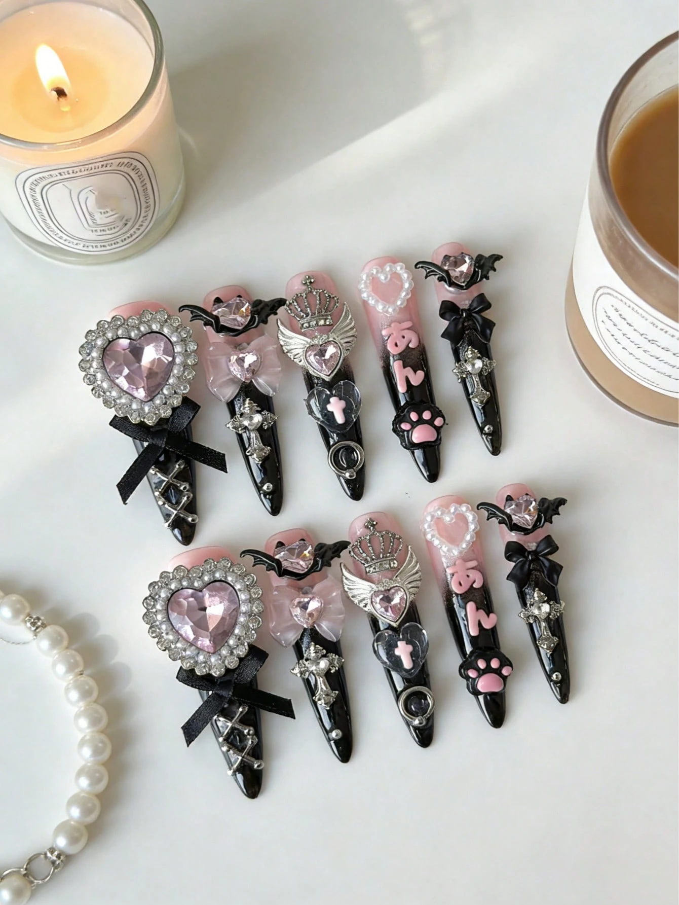 Anime 10 pezzi di unghie finte di alta qualità, a forma di croce, corona, fiocco, cuore grande e farfalla, stile Y2K con contrasto nero e rosa, a forma di mandorla extra lunghe e staccabili, adatte per vacanze, feste, balli e uso quotidiano, con 3 pezzi di adesivo biadesivo inclusi