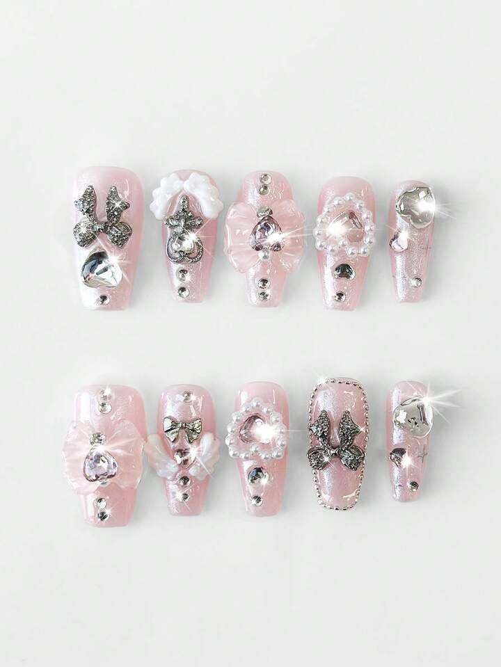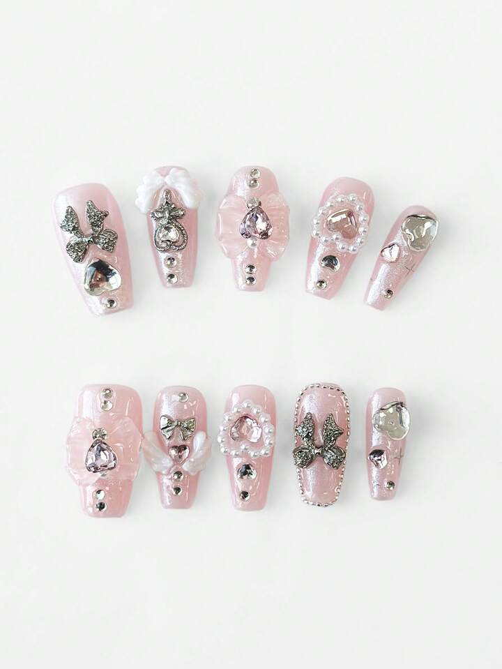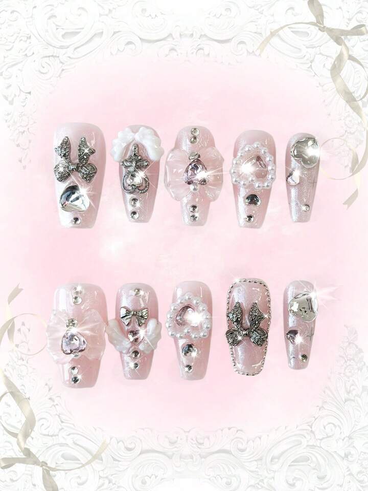 Anime 10 pezzi di elementi decorativi a forma di fiocco e ali d'amore dipinti a mano di alta qualità per unghie finte + 3 pezzi di nastro biadesivo, stile Y2K con adesivi a forma di diamante e paillettes, forma a bara, adatti per feste, balli e uso quotidiano.