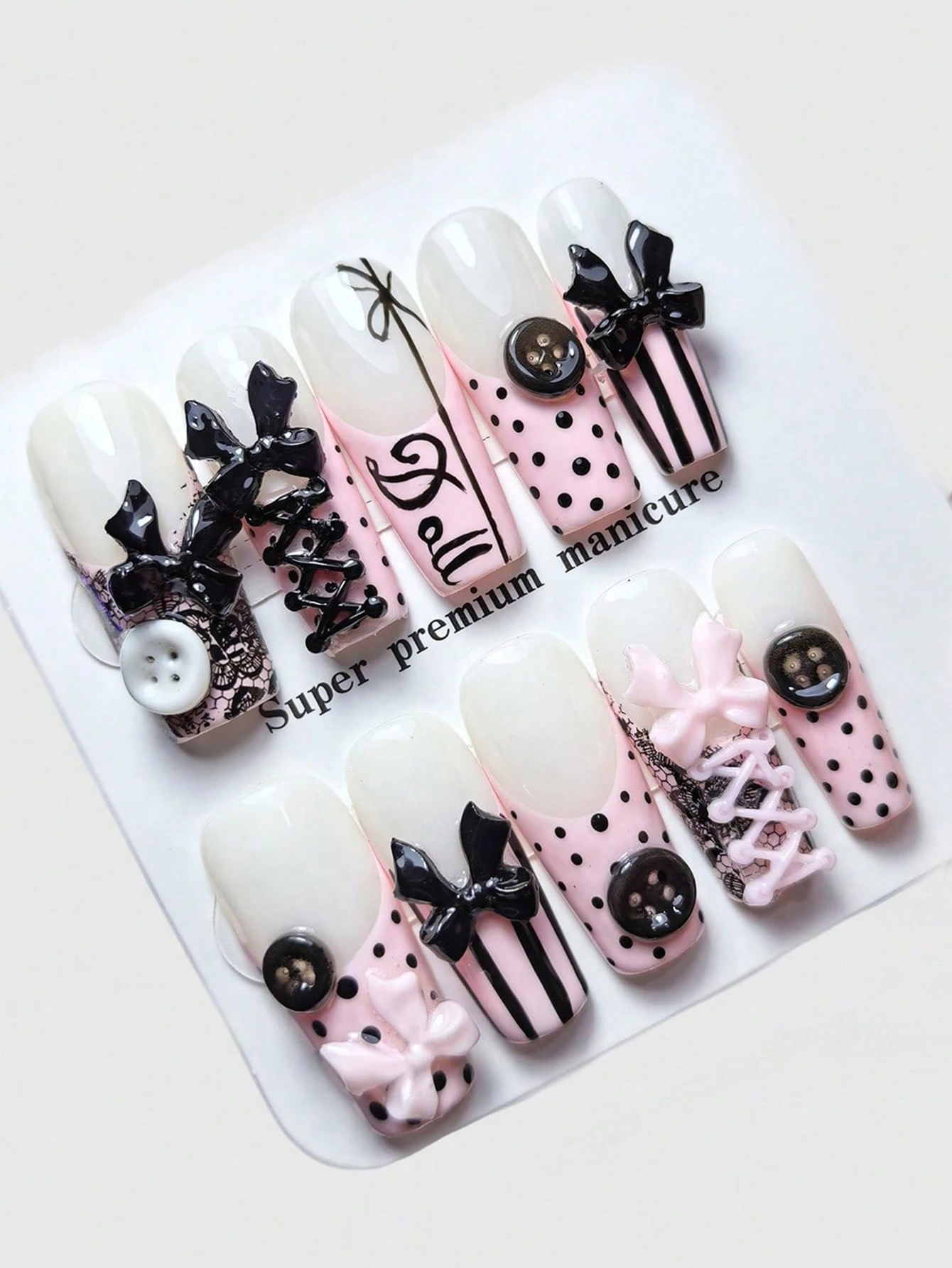 Anime 10 pezzi di elementi decorativi in nastro e bottone carini e di alta qualità per unghie finte + 3 pezzi di nastro biadesivo, unghie a forma di bara media e lunga con contrasto di colore rosa e nero stile ballerina, unghie finte in pizzo nero riutilizzabili di alta qualità adatte per feste, balli e uso quotidiano.