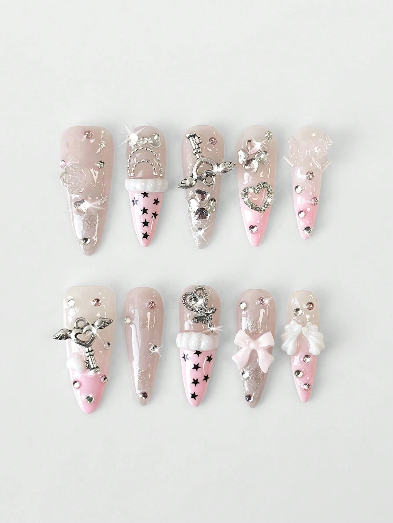 Anime 10 pezzi di unghie finte di alta qualità, decorate con elementi romantici come fiocchi, rose, stelle e quadrifogli, con 3 pezzi di nastro biadesivo. Unghie a forma di mandorla, lunghe e glitterate, adatte per feste, balli e uso quotidiano.