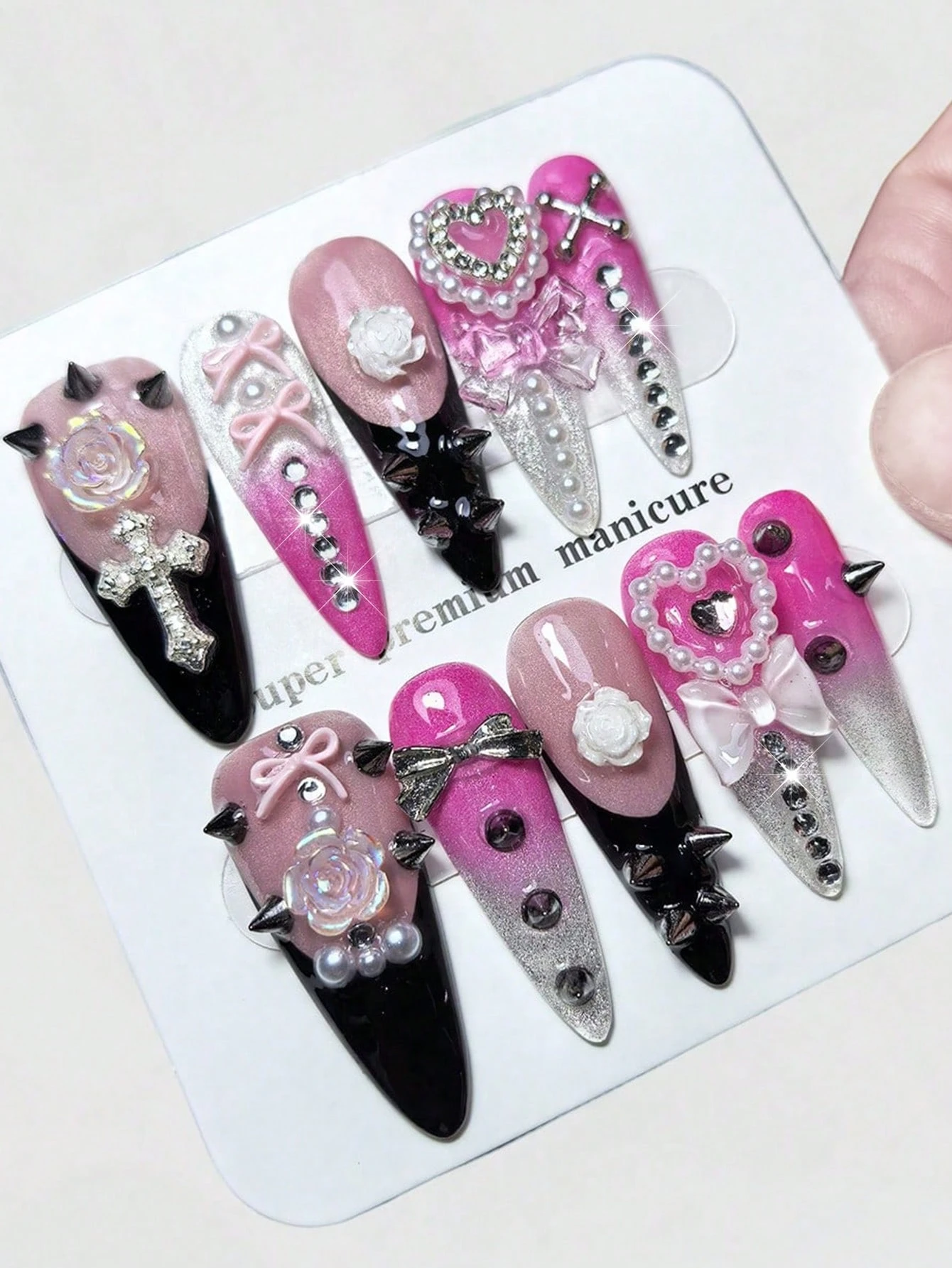 Anime 10 pezzi di rivetti in stile Y2K, armatura francese dipinta a mano colorata, adesivo di alta qualità con fiocco rosa, unghie finte a mandorla super lunghe e rimovibili, riutilizzabili in tutte le stagioni, adatte per uso quotidiano e uscite