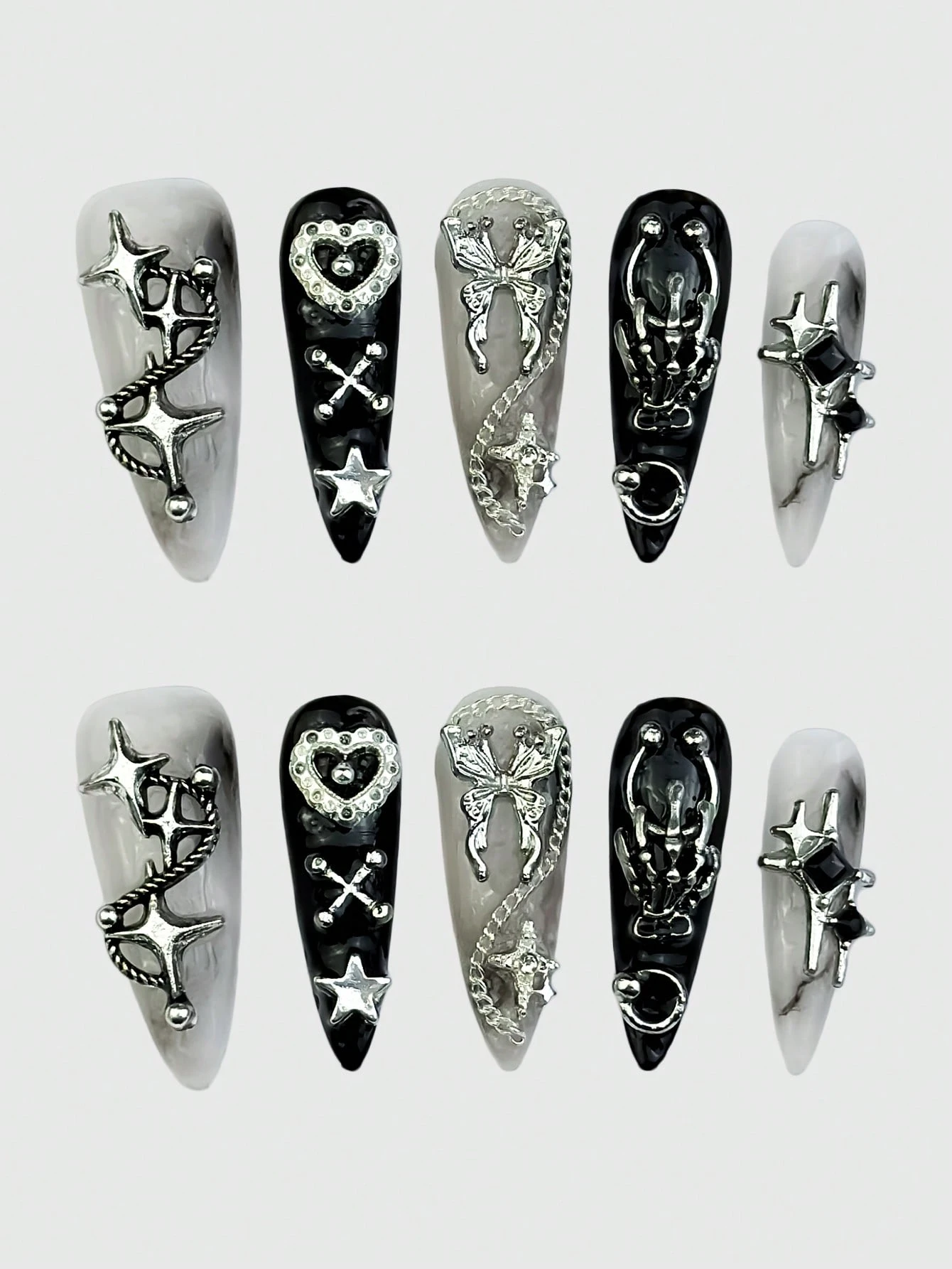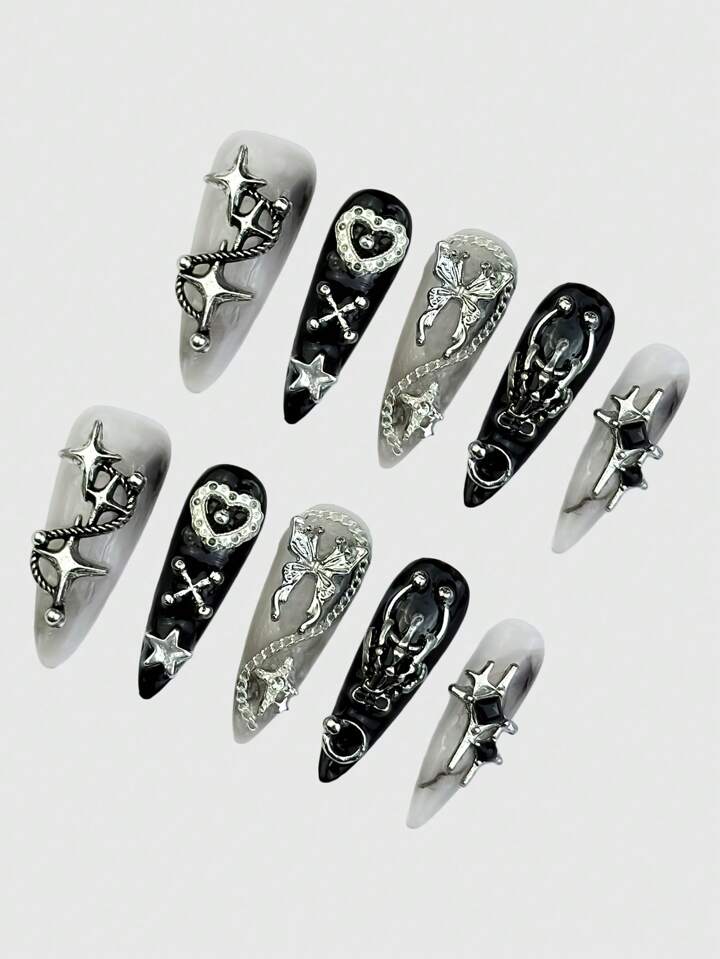 Anime Set da 10 pezzi di unghie finte con motivi a farfalla, cuore, teschio e stella marina, con 1 foglio di nastro per unghie
