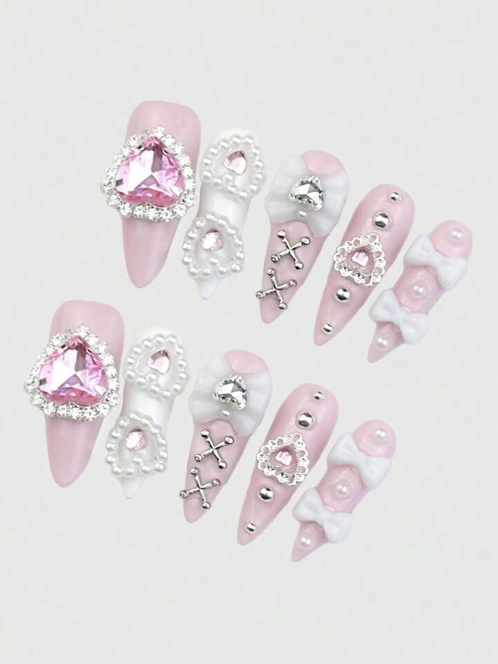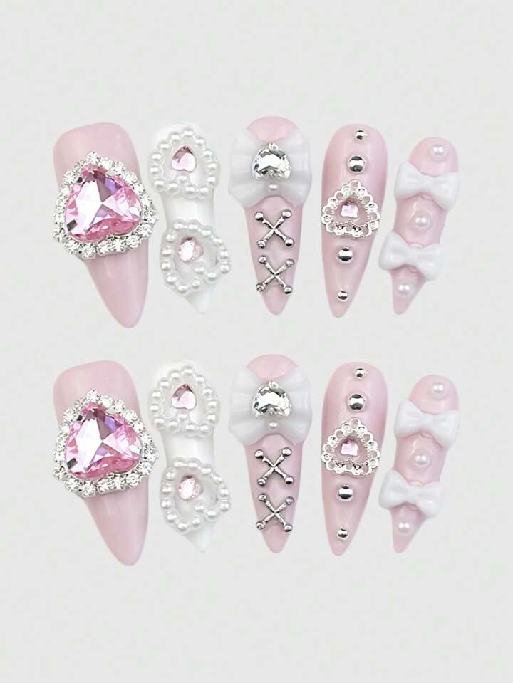 Anime 10 pezzi/set Unghie finte Y2K graziose con cuori e fiocchi, con 1 pezzo di nastro adesivo