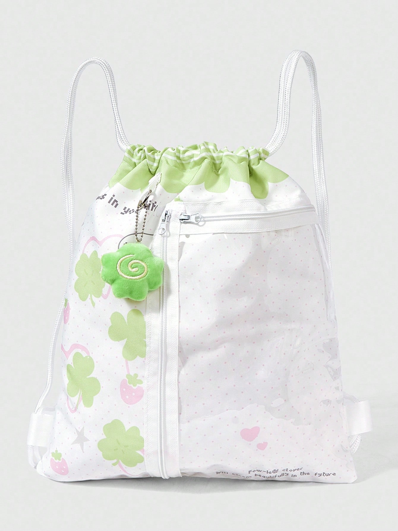 Anime 1 pezzo Zaino con coulisse bianco kawaii con stampa a pois e quadrifoglio minimalista, dolce e carino stile retrò, adatto per pendolarismo quotidiano, shopping, palestra, ecc.