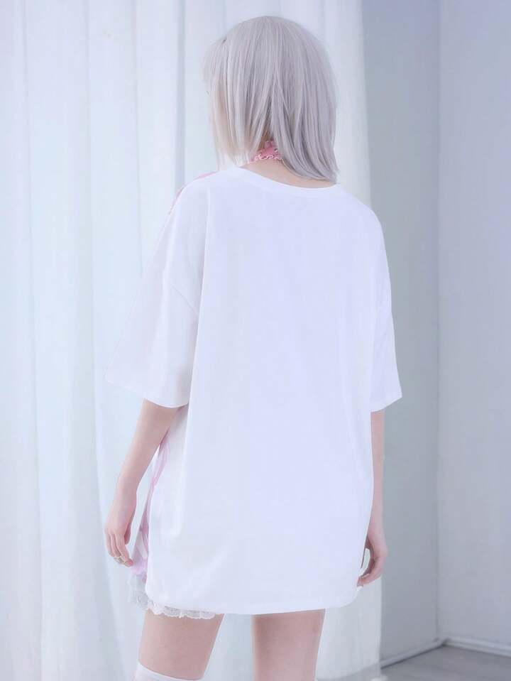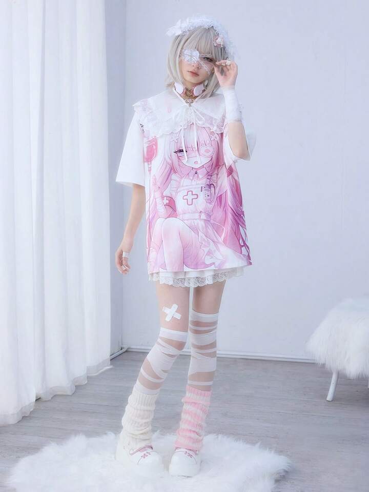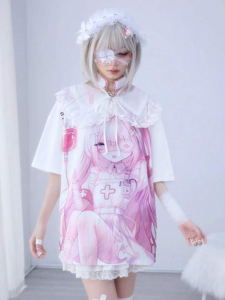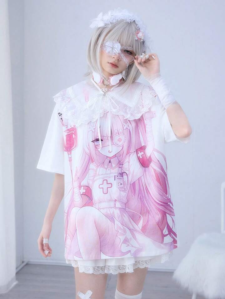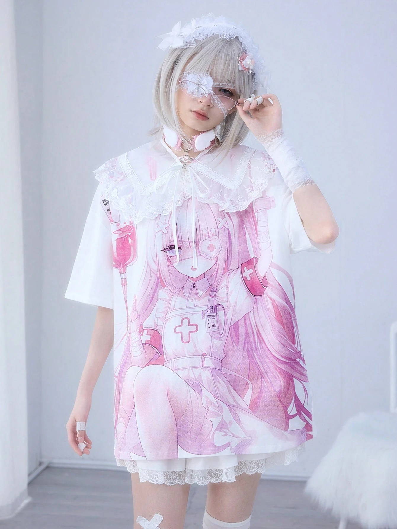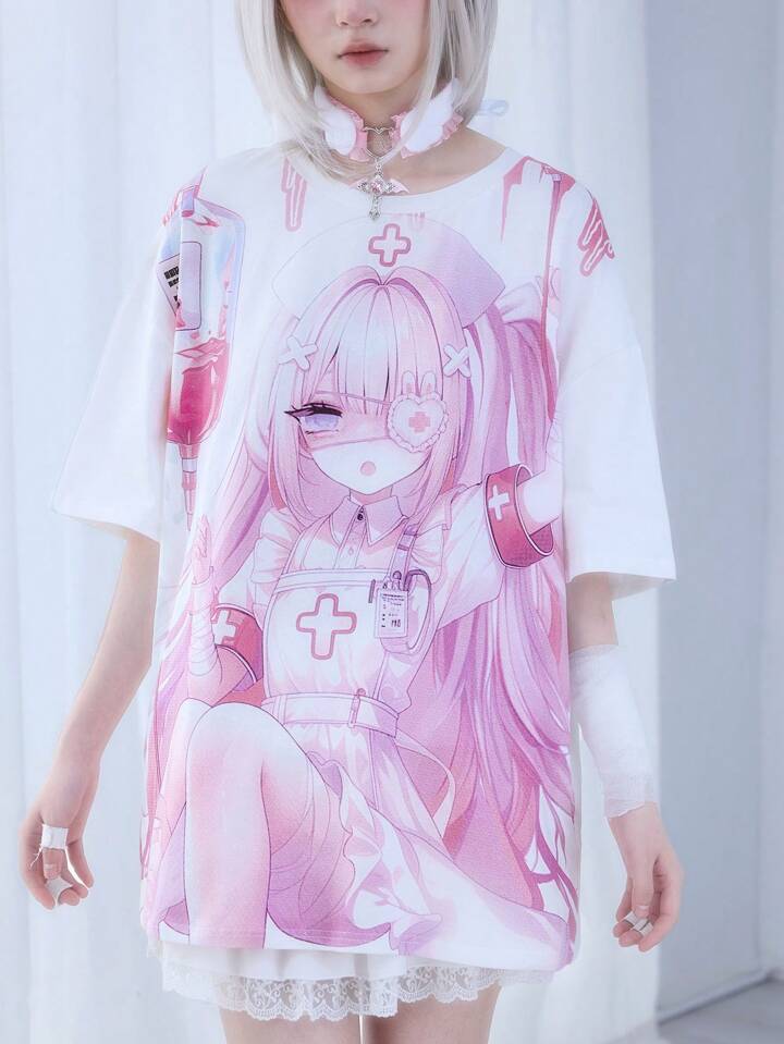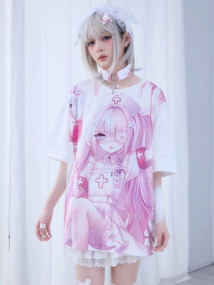 Maglietta a maniche corte con stampa di una ragazza "Yandere" di un anime, a vestibilità ampia e girocollo, colore rosa