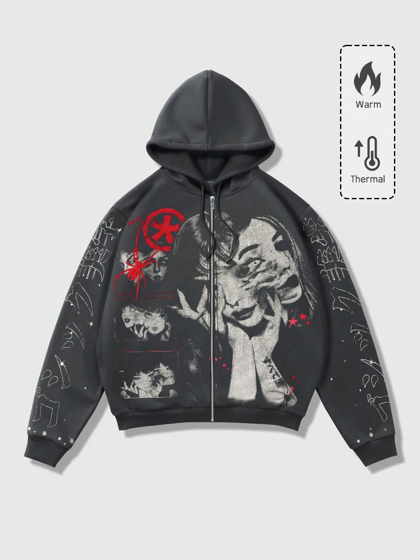 Anime Felpa con cappuccio, chiusura lampo e maniche lunghe, con stampa di ritratto di strada, per uomo