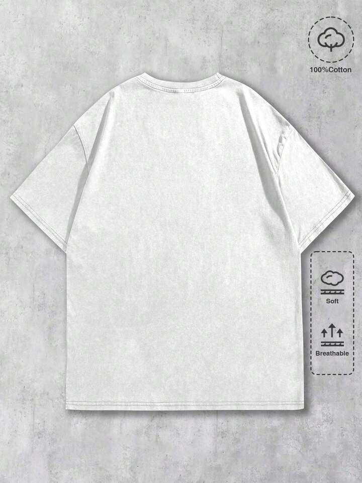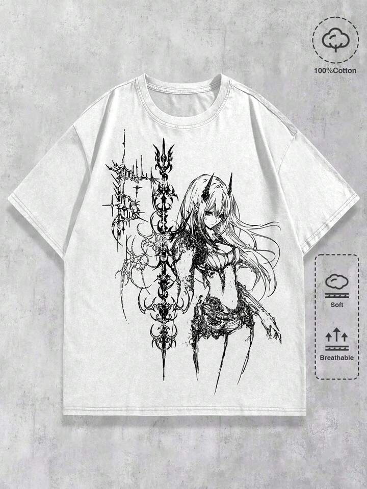 Anime Maglietta da uomo in stile Y2K, lavata bianca, con stampa grafica scura