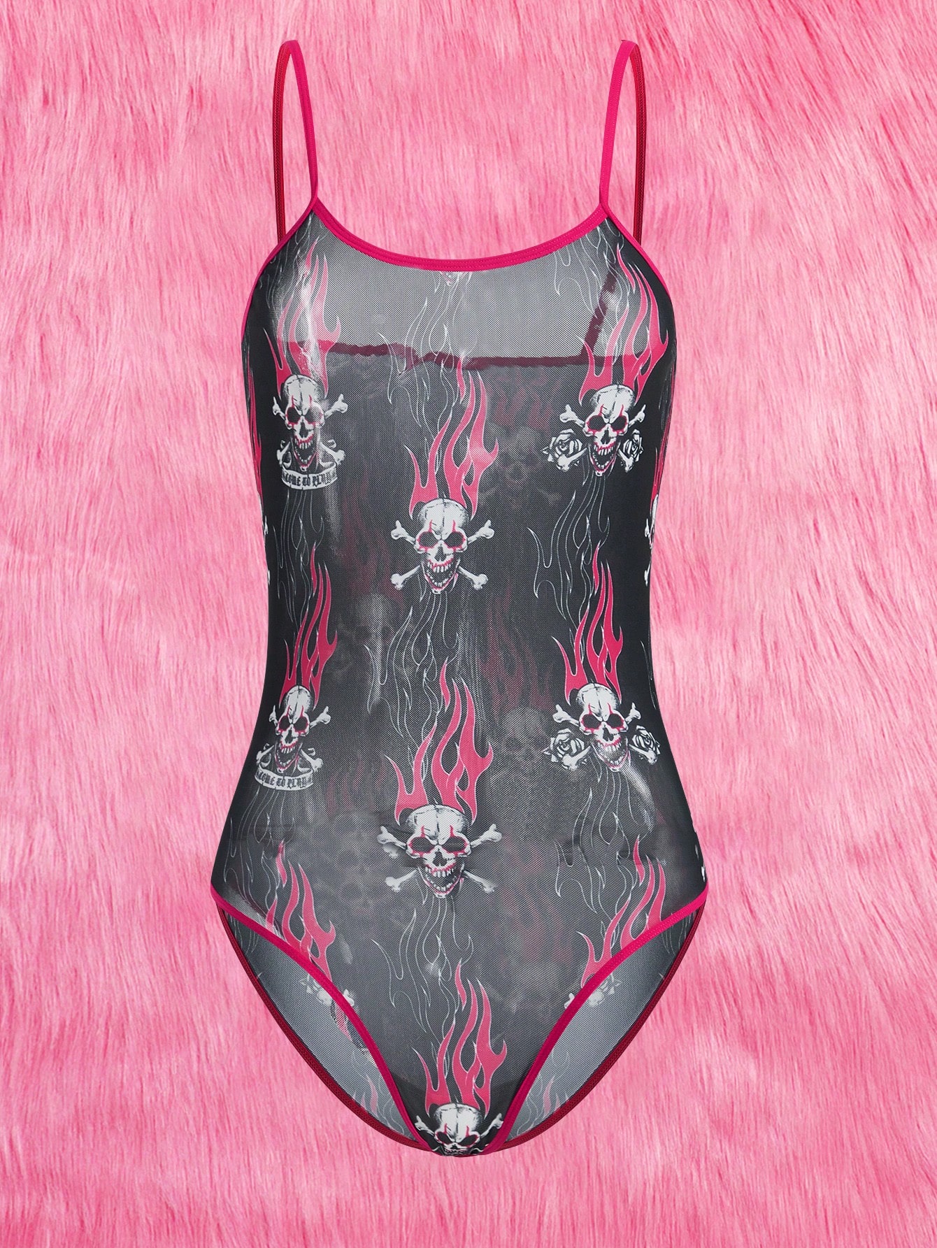 Anime Body teddy teschio & con stampa fiamme bordo a contrasto mesh