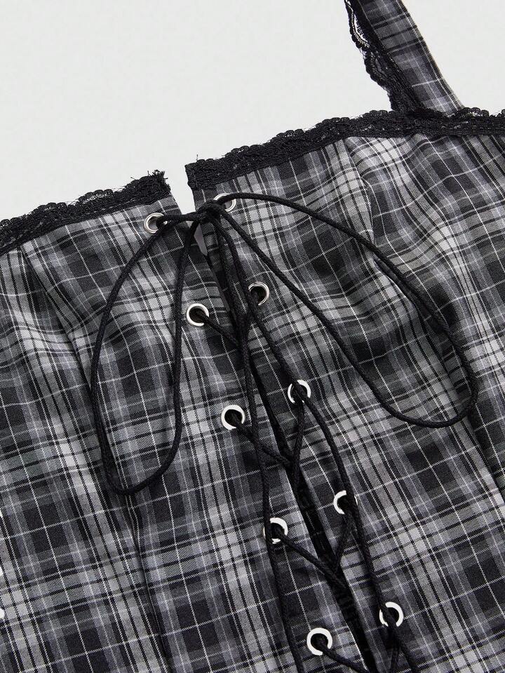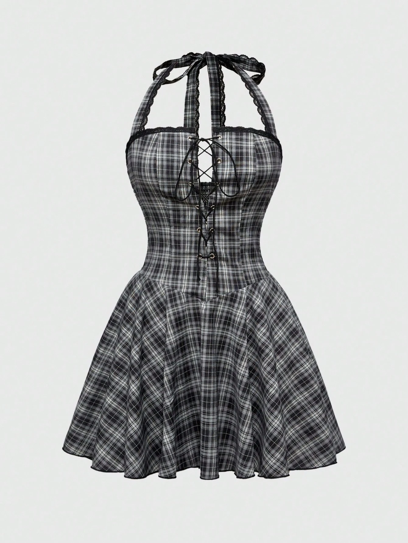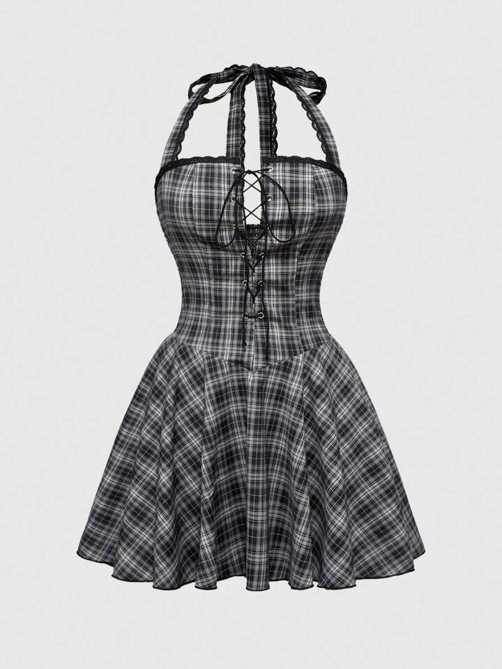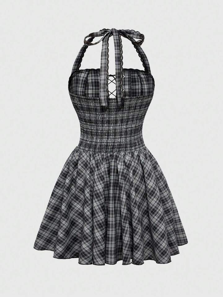 Anime Abito mini super corto vintage con scollo alla halter e lacci, a quadri