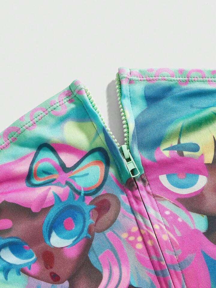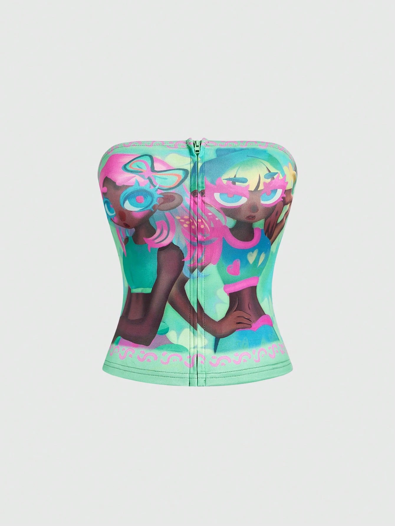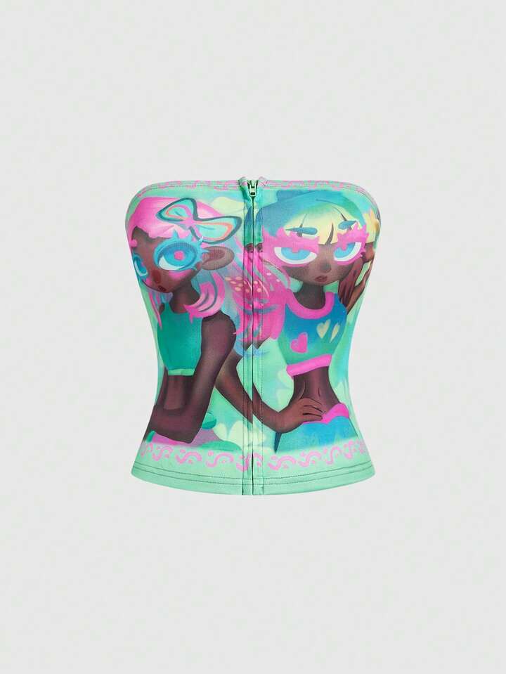 Anime Canotta corta con cerniera anteriore e stampa divertente e carina di ragazza per donna