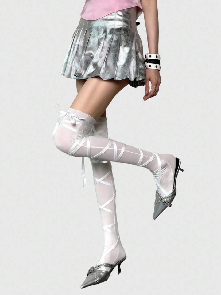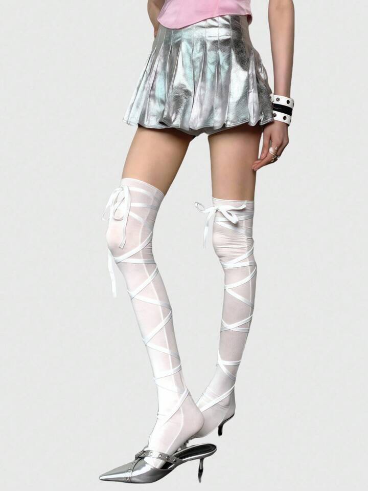Anime Calze lunghe asimmetriche stile punk Y2K con cinturino a croce, calze sopra il ginocchio di colore solido regolabili per donne