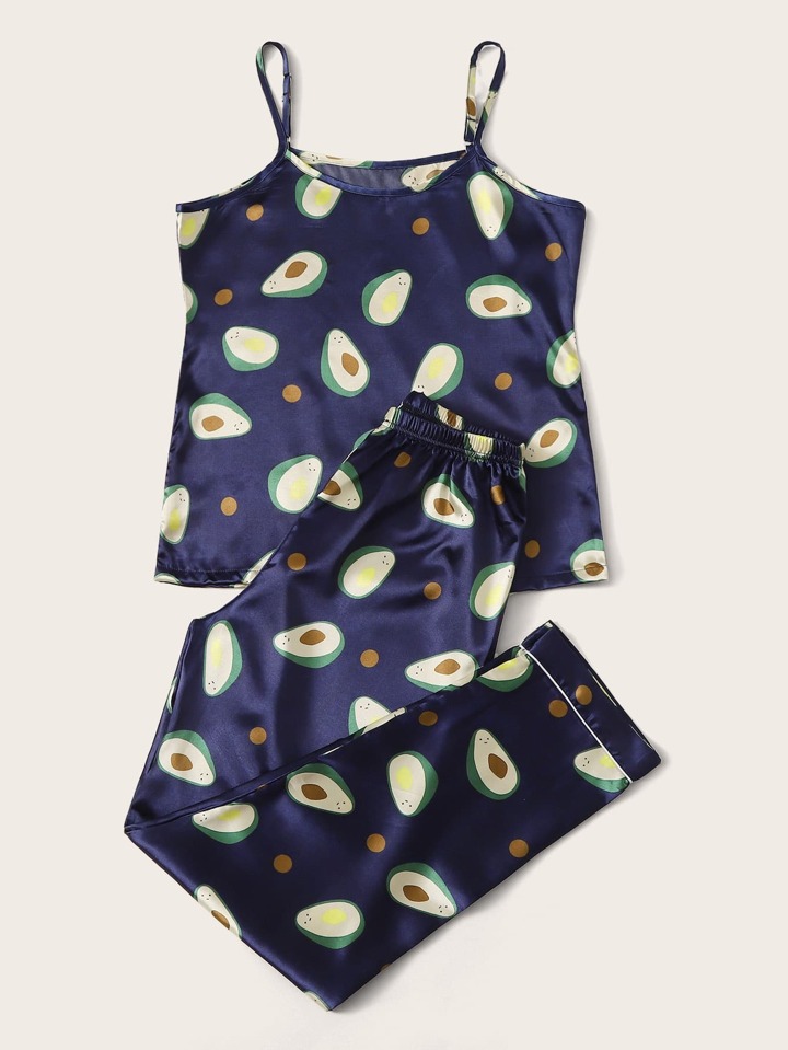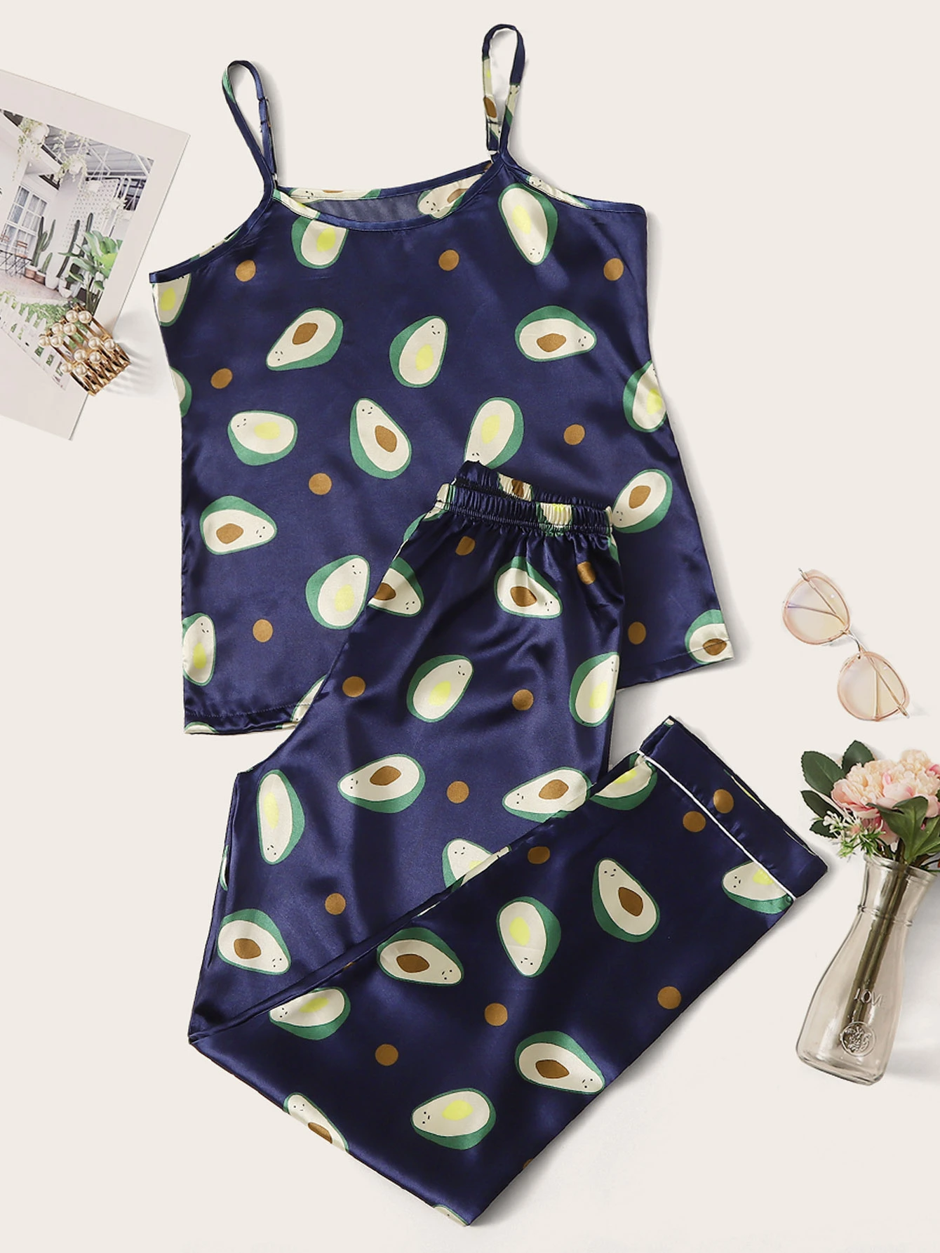 Set pigiama in raso con bretelle sottile e stampa avocado