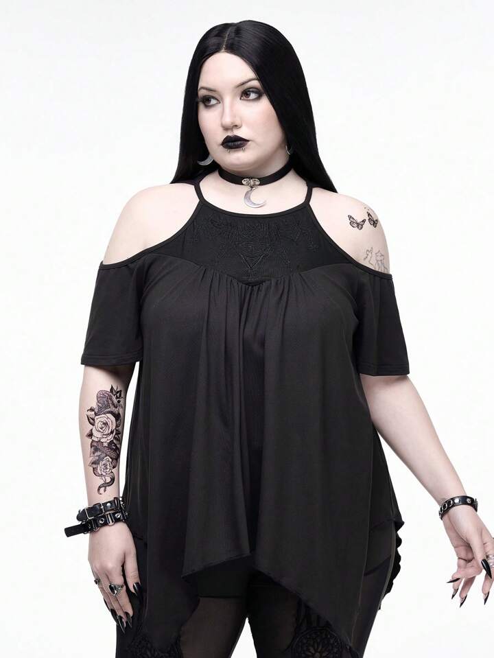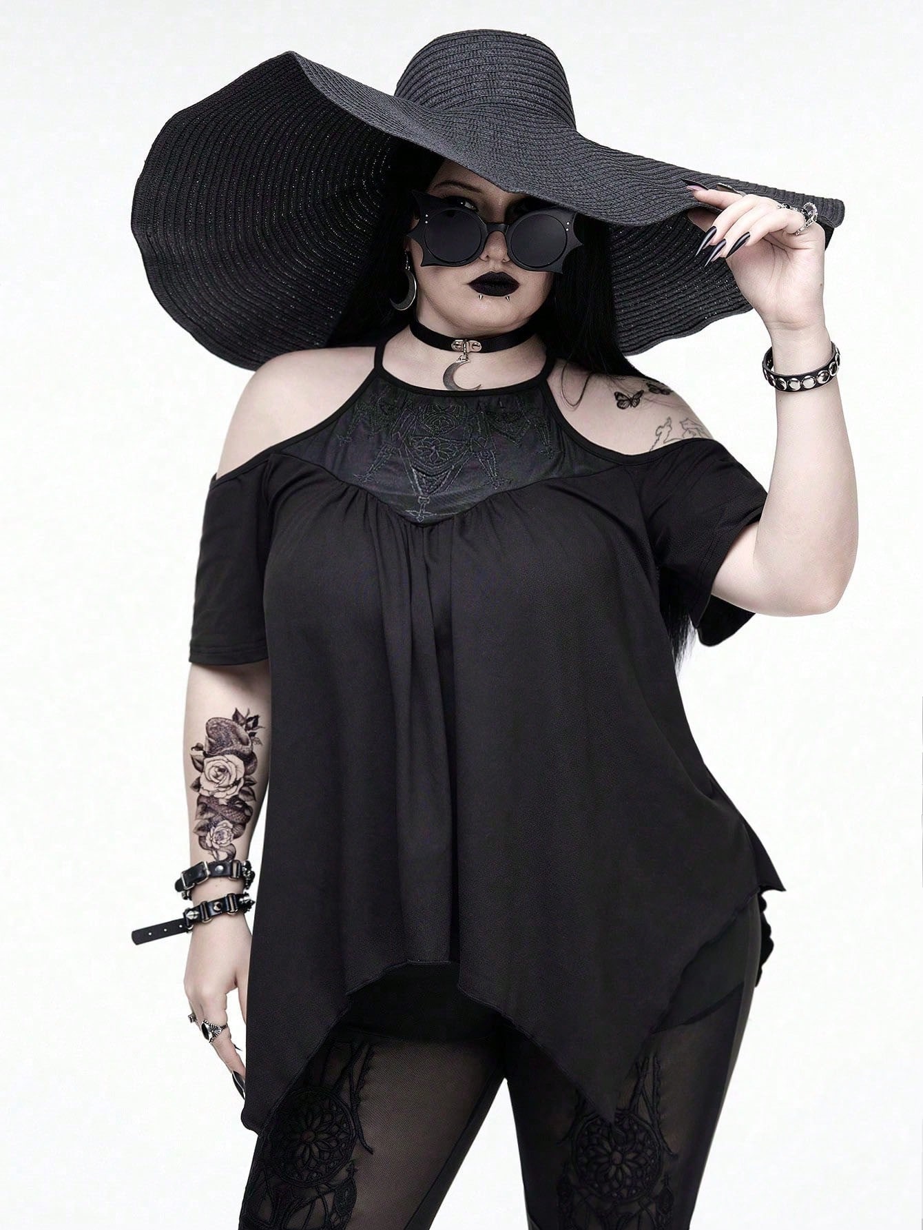 Goth Maglietta casual e comoda di taglia grande con pannello in rete a tema gotico scuro, bordo asimmetrico e motivo floccato di castello, adatta a donne di taglia grande