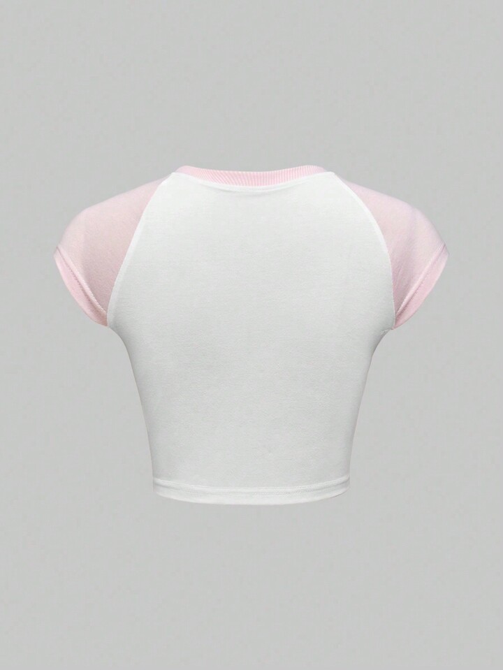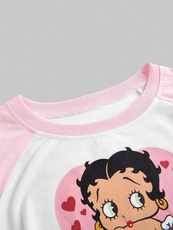 Betty Boop | ROMWE Maglietta corta aderente estiva con stampa di personaggi dei cartoni animati, lettere e blocchi di colore, maniche a raglan, baby tee per donna, scuola