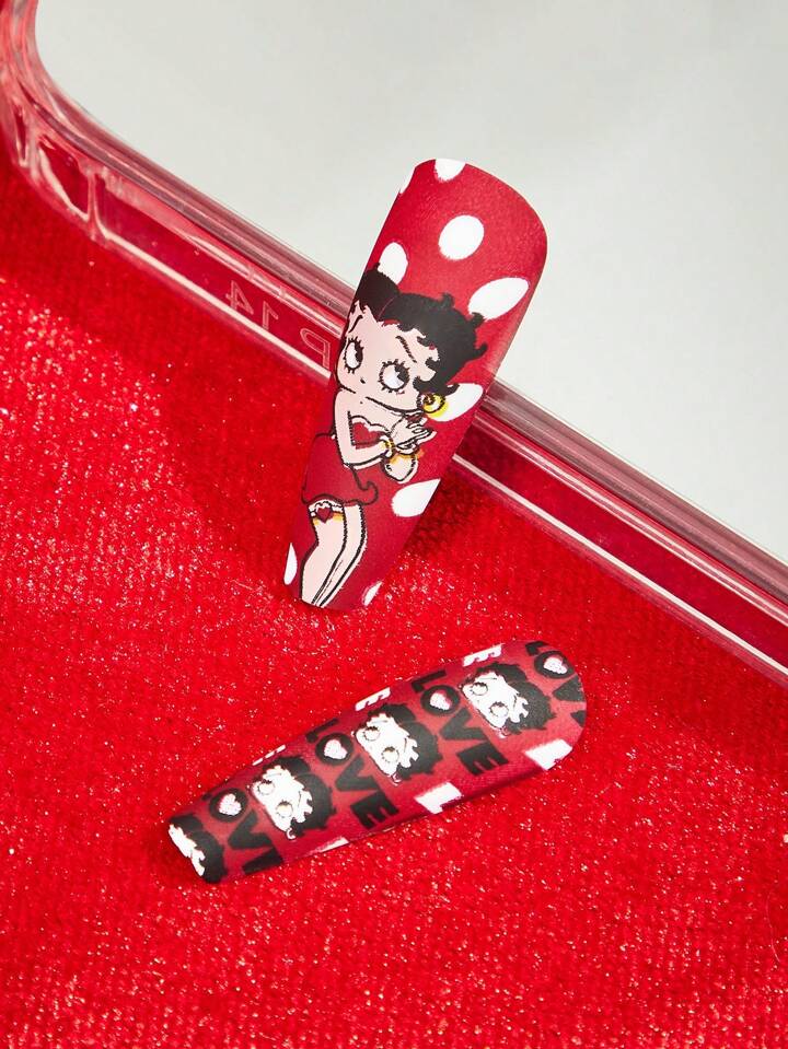 Betty Boop | ROMWE Unghie finte con stampa a pois e cuori in stile ritratto animato