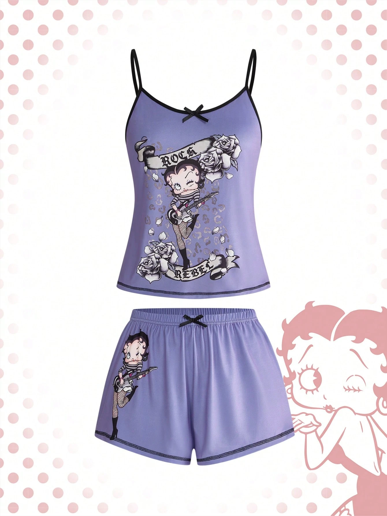Betty Boop | ROMWE Set pigiama con canotta e pantaloncini con grafica rock, stile Harajuku, con bordi a contrasto e fiocco