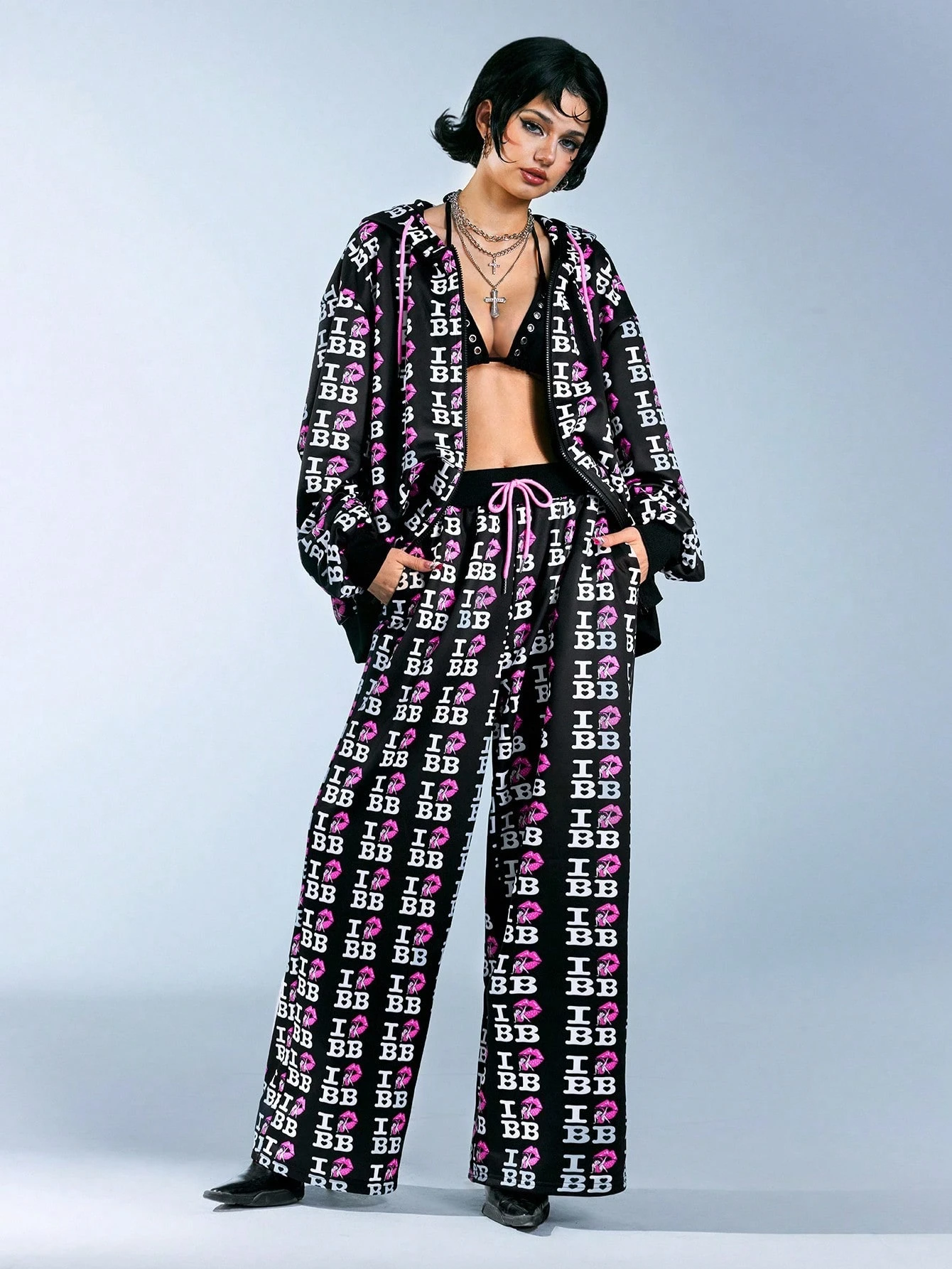 Betty Boop | ROMWE Set da 2 pezzi in stile streetwear alla moda per donne: felpa con cappuccio con chiusura a chiusura lampo e coulisse e pantaloni della tuta, con stampa a tema slogan subculturale femminile