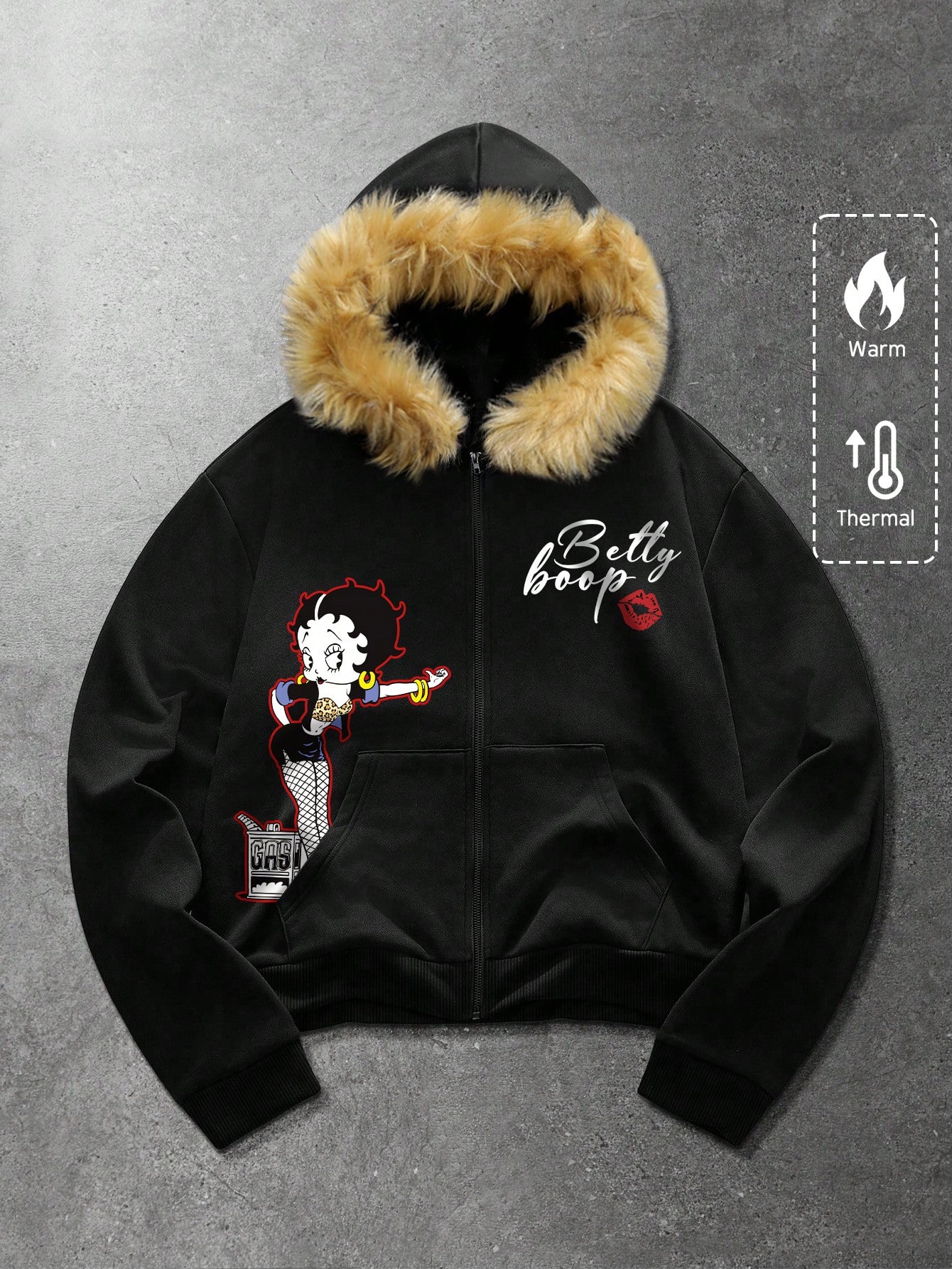 Betty Boop | ROMWE Felpa con cappuccio da uomo, stile urban americano, con colletto in pelliccia, grafica con testo in inglese e ragazza cartoni animati, dettagli in pelliccia a contrasto