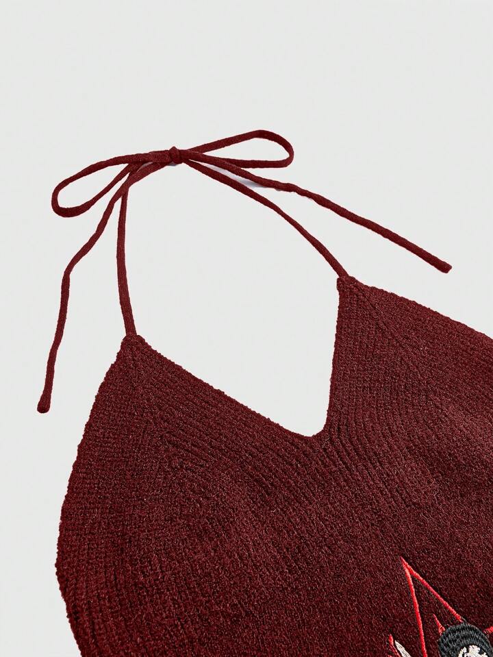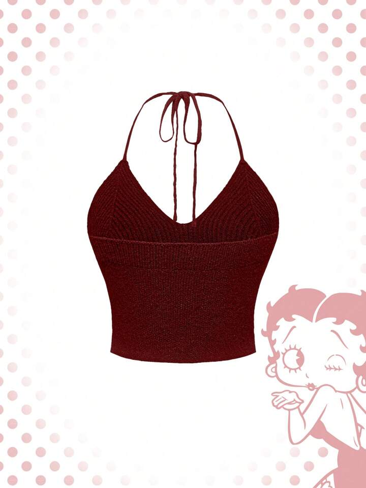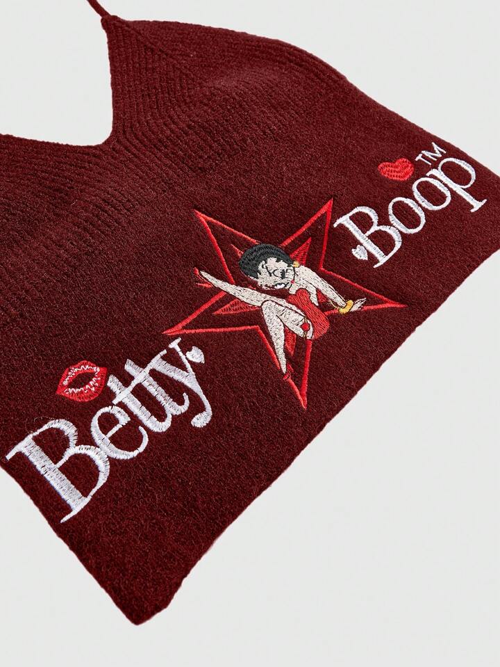 Betty Boop | ROMWE Top corto rosso a maglia con collo alluncinetto e ricamo di lettere e figura per donne