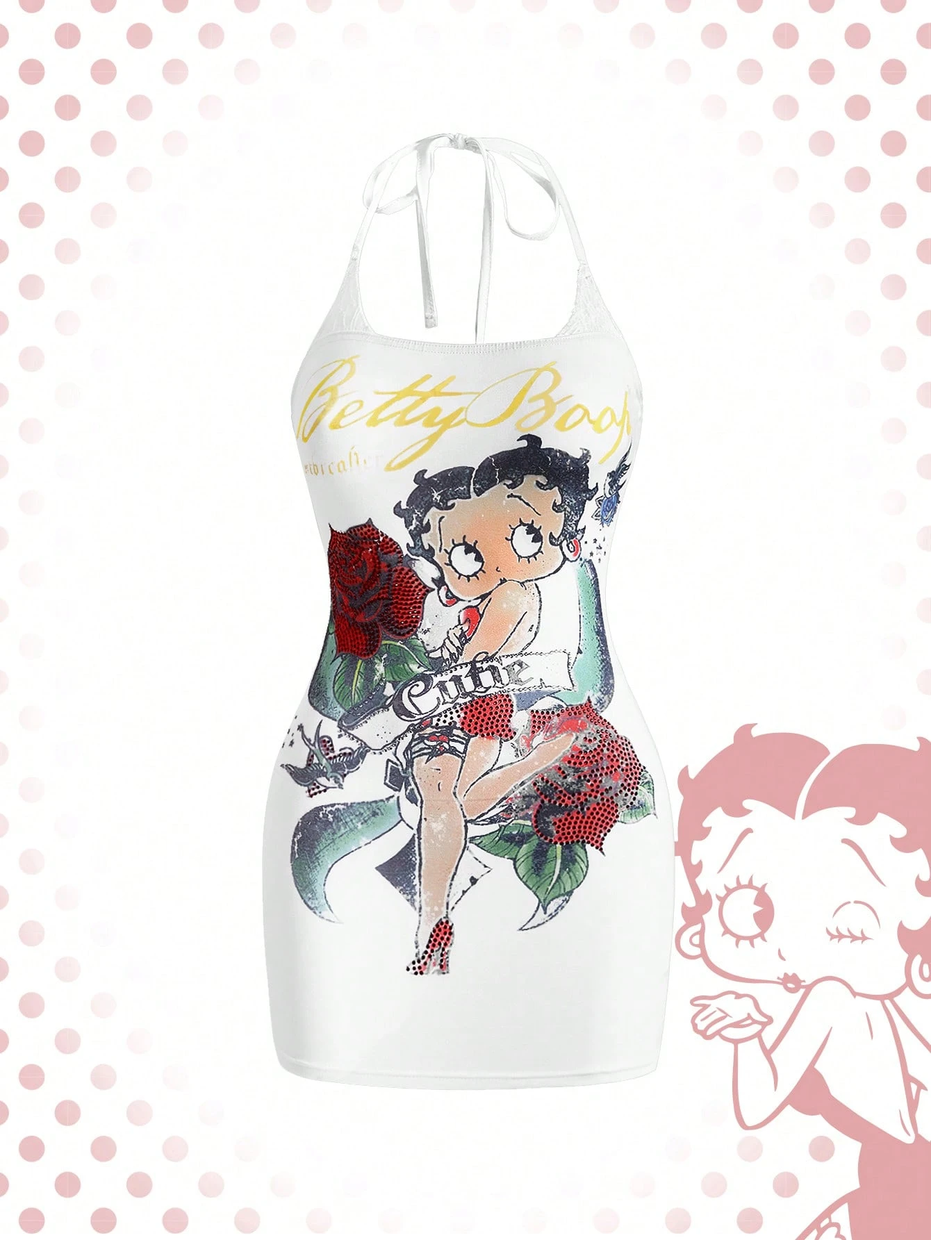 Betty Boop | ROMWE Abito mini aderente con scollo alla halter, stampa retrò sexy Betty, contrasto di pizzo e strass, in stile Y2K