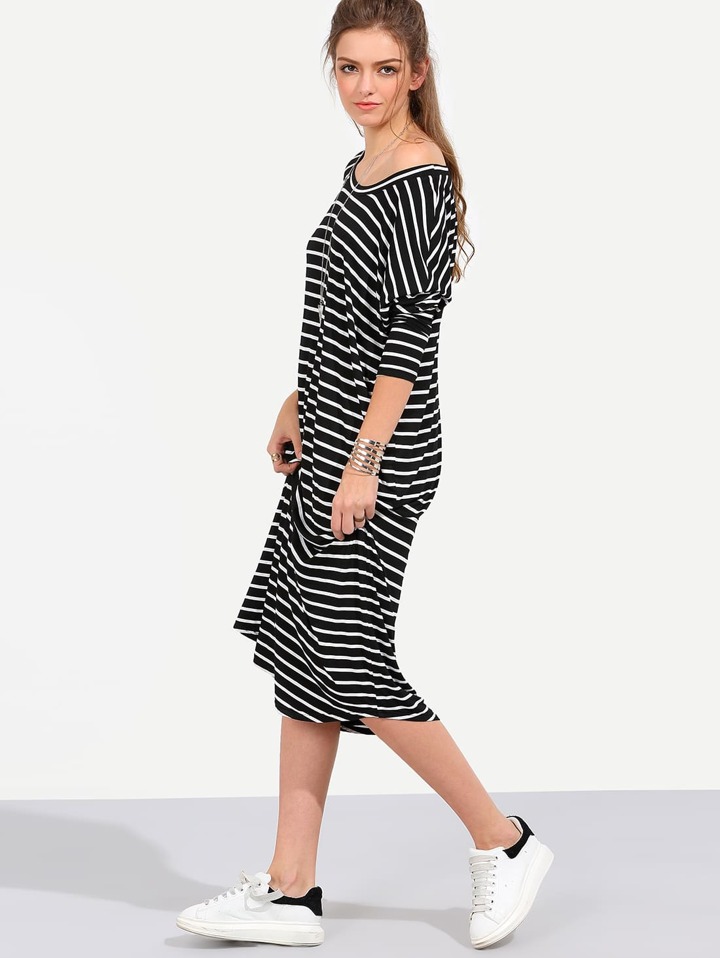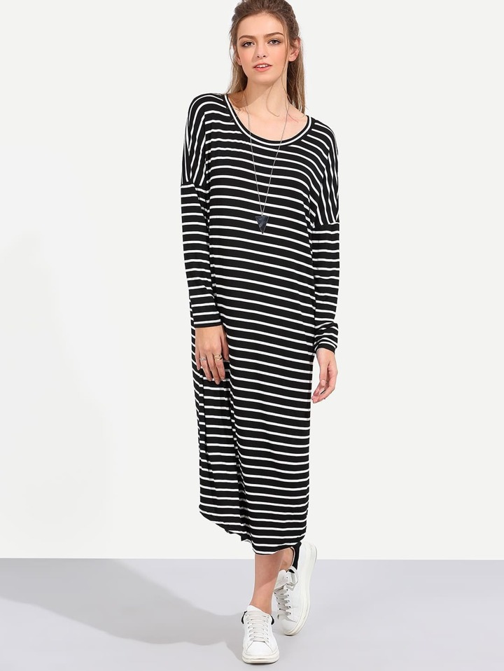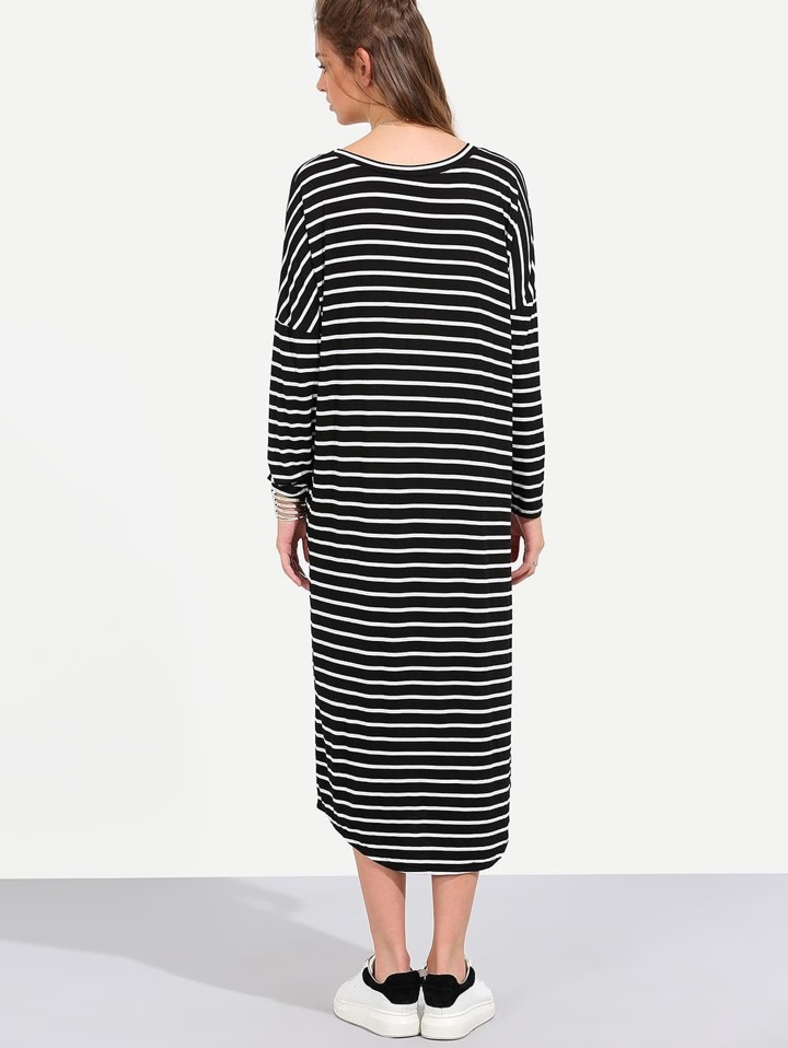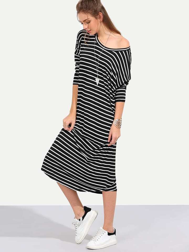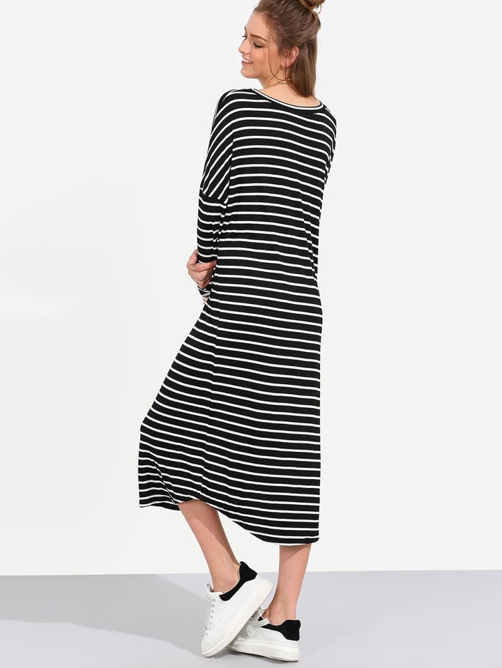 Vestito Midi Shift Maniche Lunghe A Strisce - Nero E Bianco