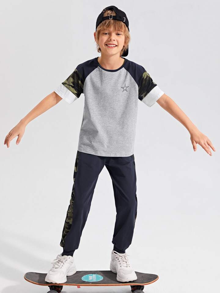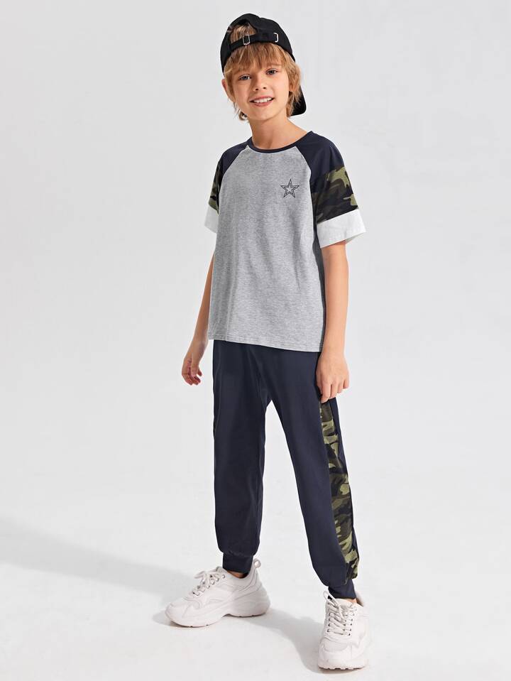 Da Ragazzi Pantaloni sportivo e Top Set color block mimetico manica con stampa stella