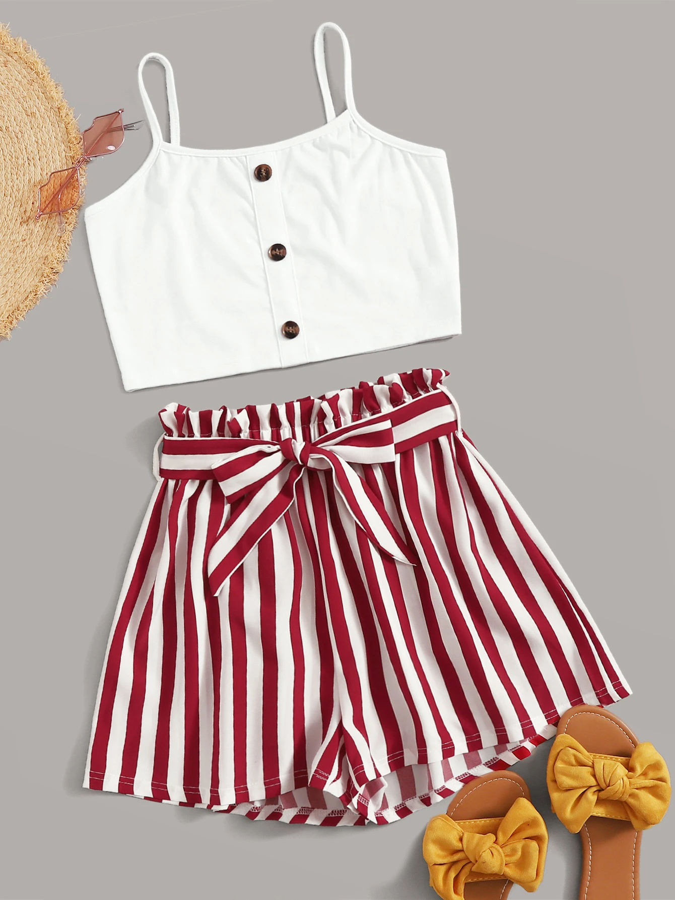 Shorts a righe con cintura e vita a volant sovrapposti e Top con bretelle sottili e bottone frontale