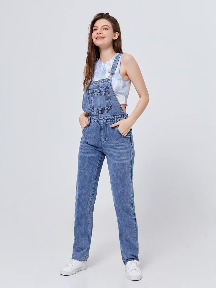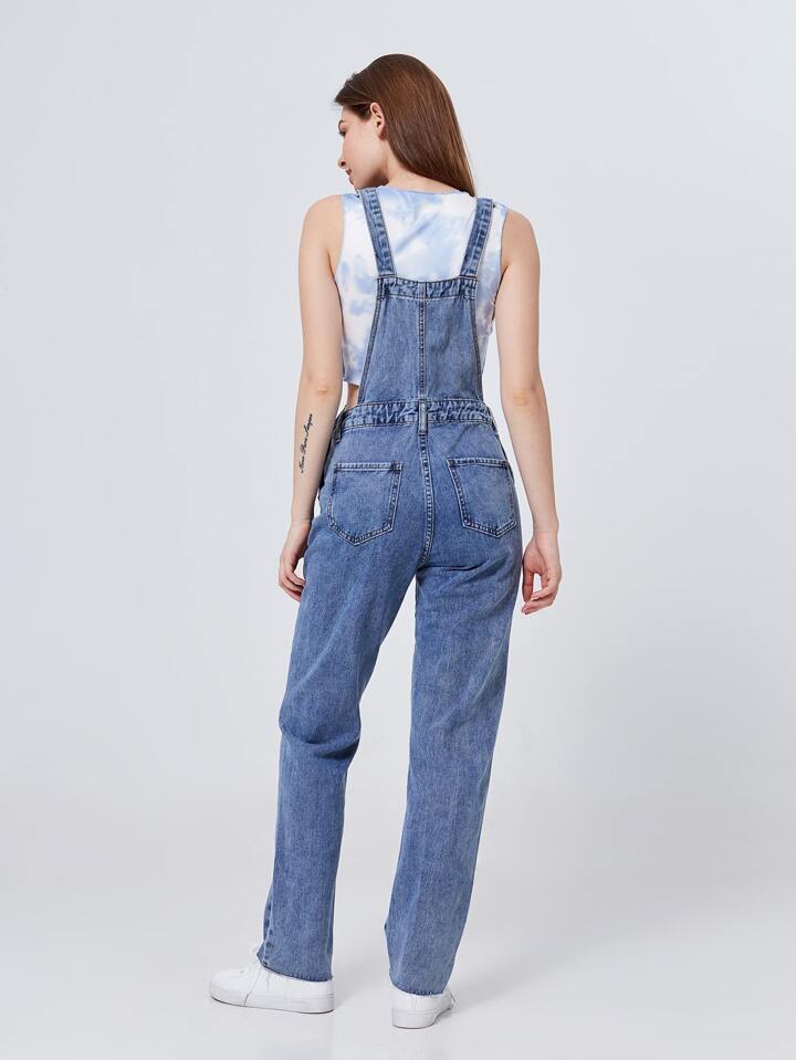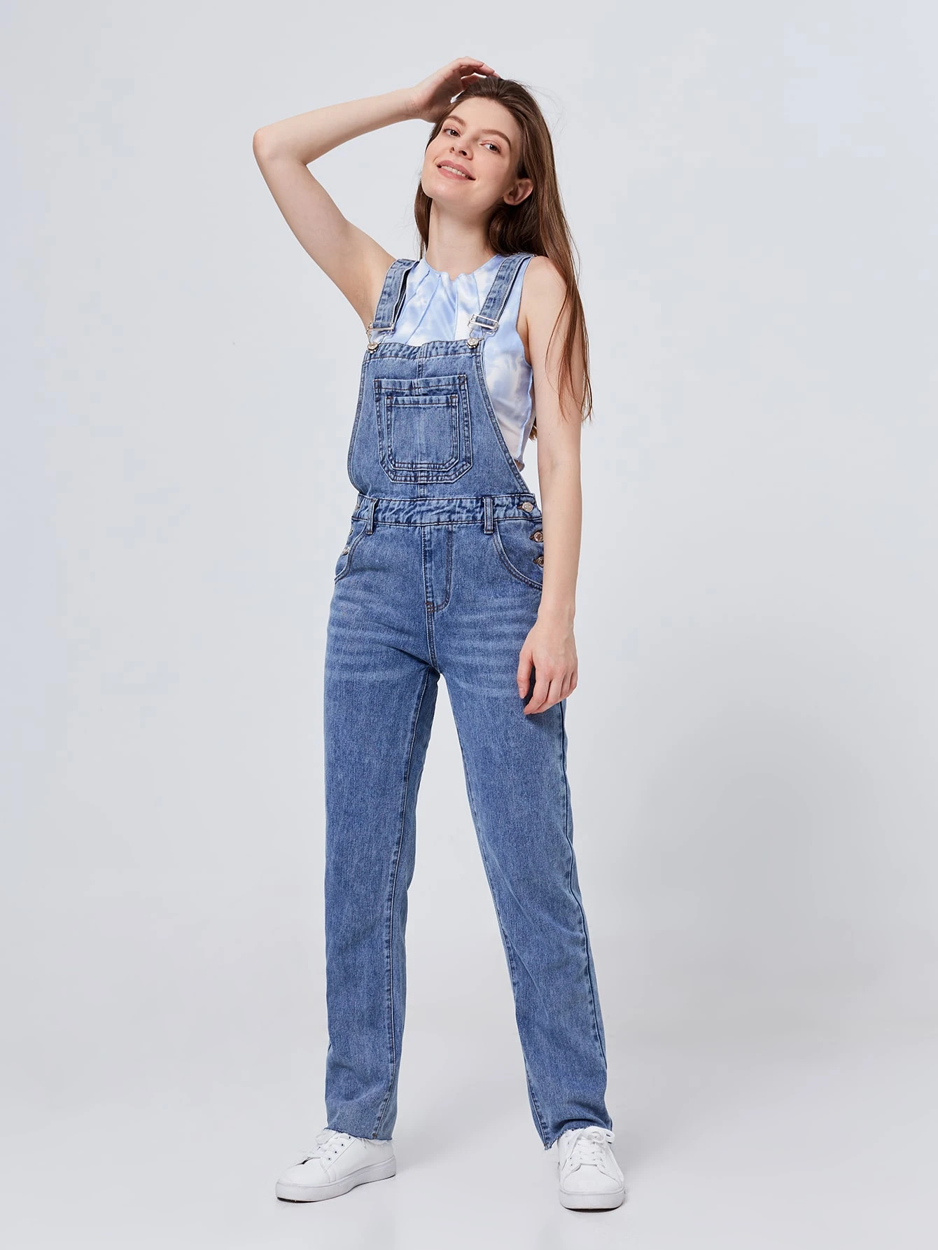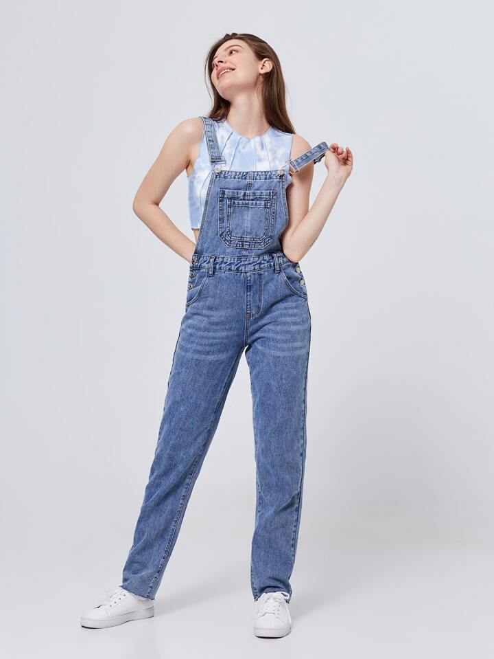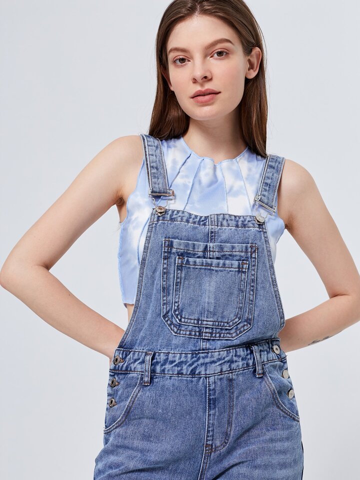Tasche laterali applicate con bottone e salopette in denim con orlo grezzo