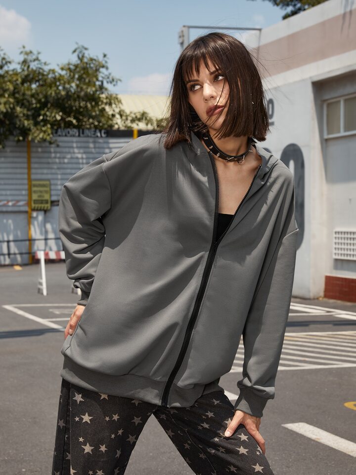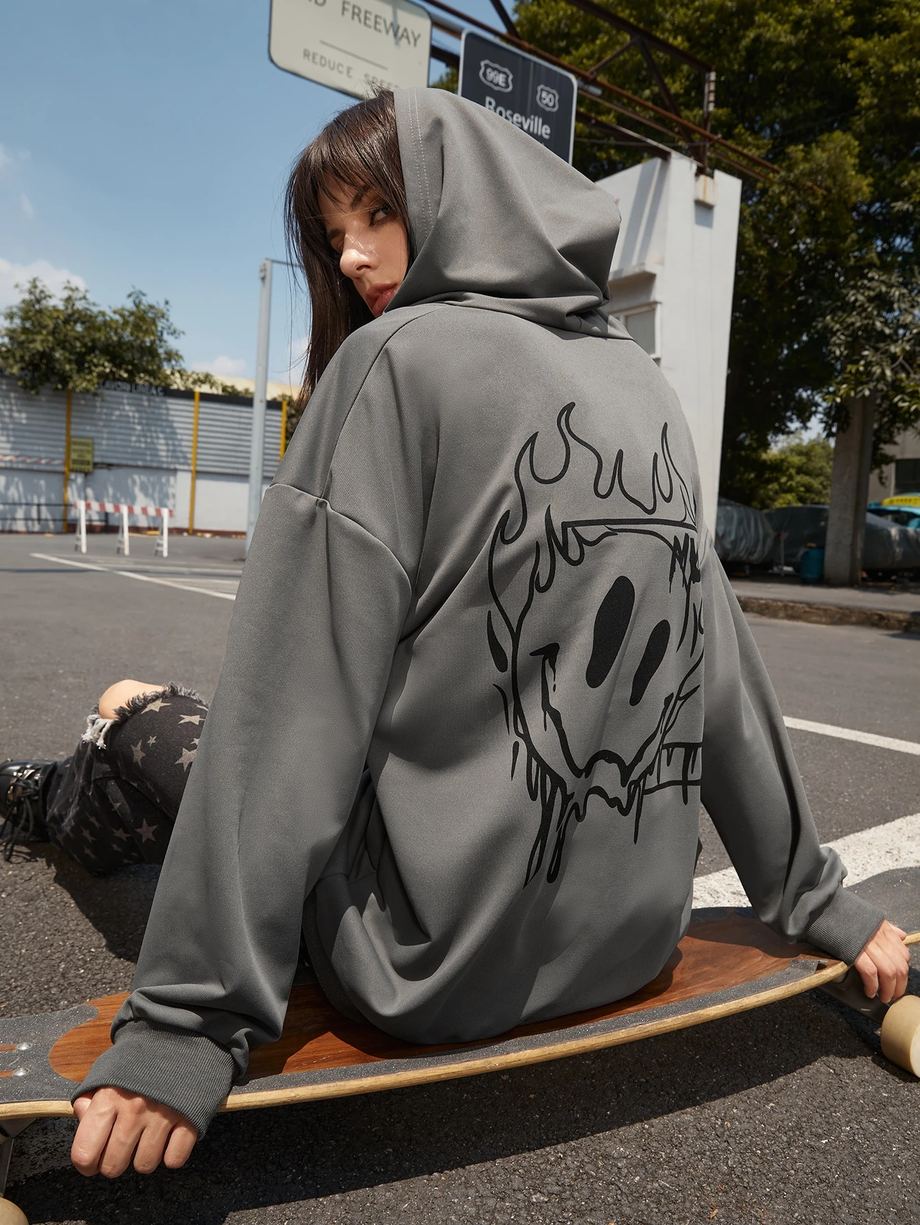 Felpa con cappuccio stampa viso di fumetto spalle cadenti