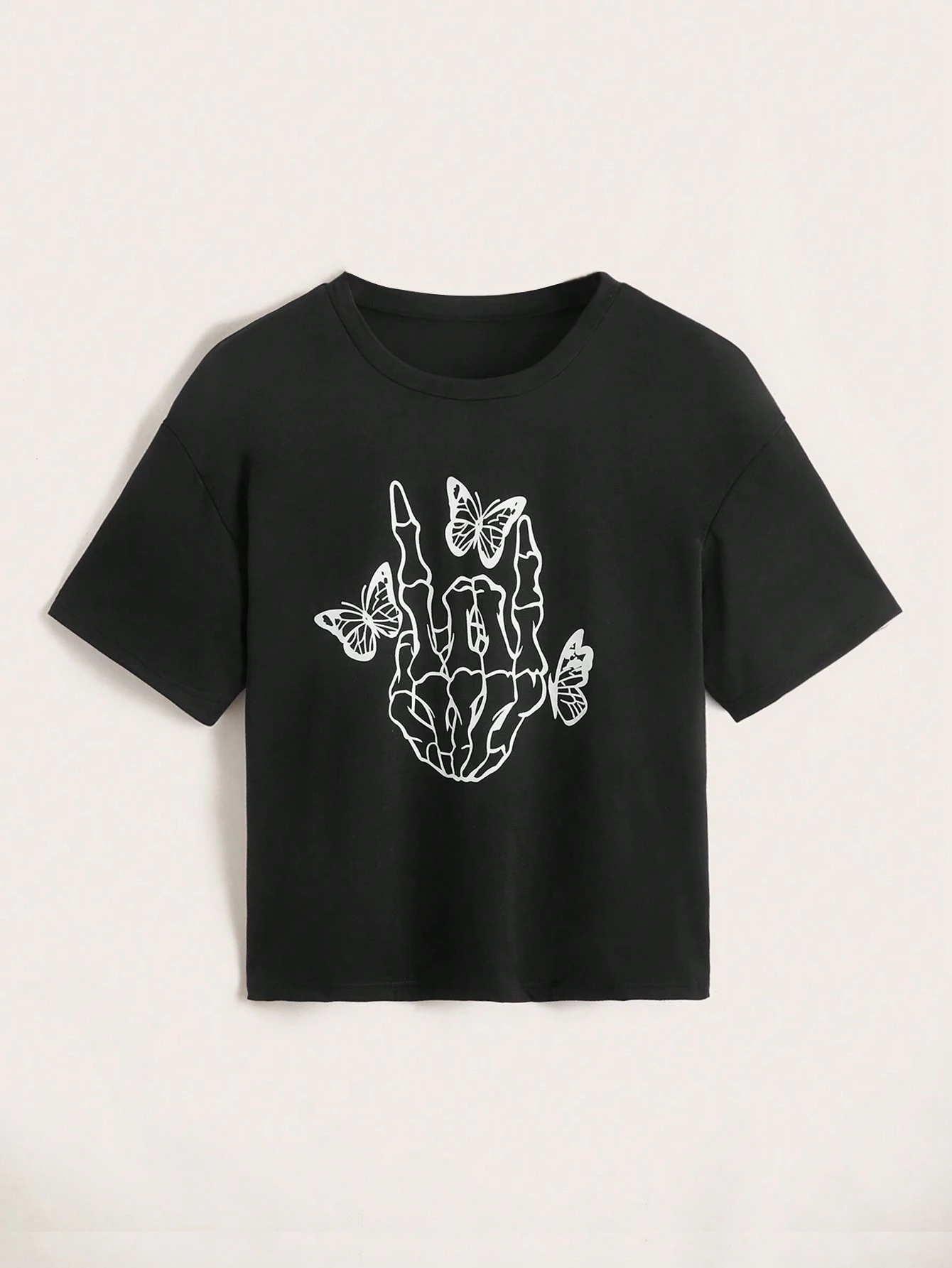 T-shirt casual a maniche corte con stampa di teschi e farfalle, estiva