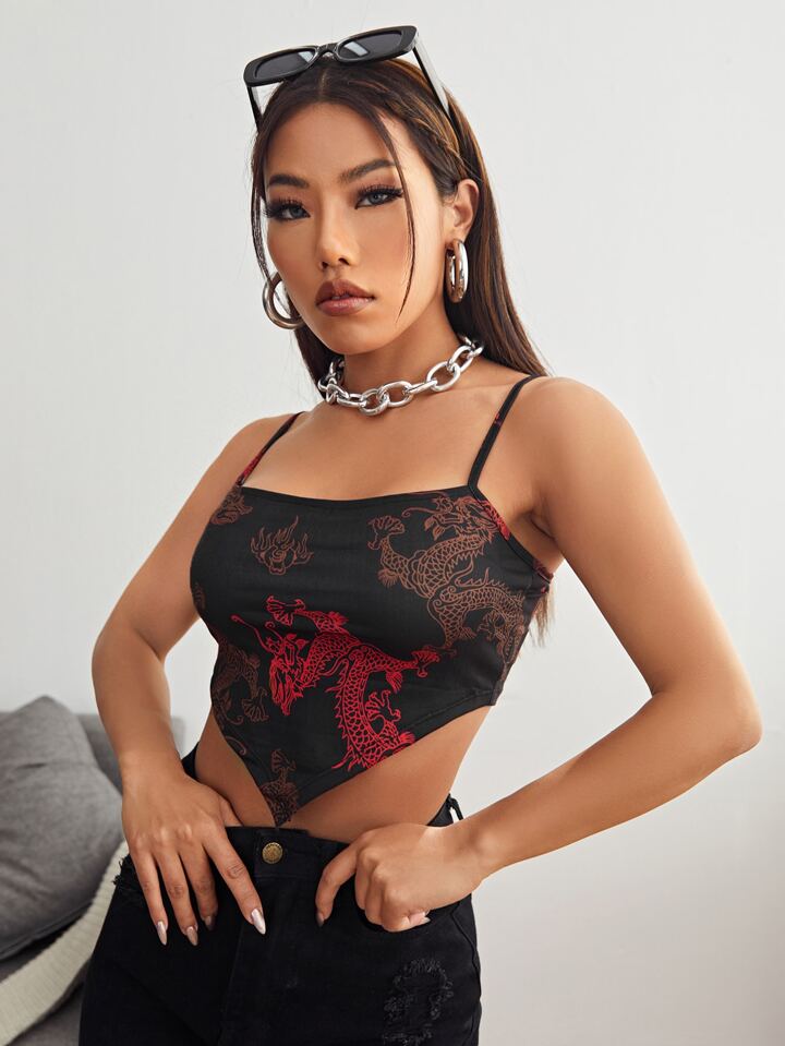 Top con bretelle sottile con orlo asimmetrico con stampa di dragone cinese