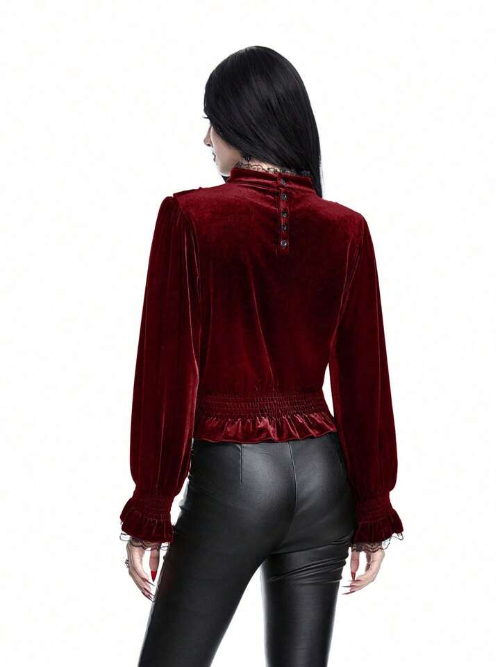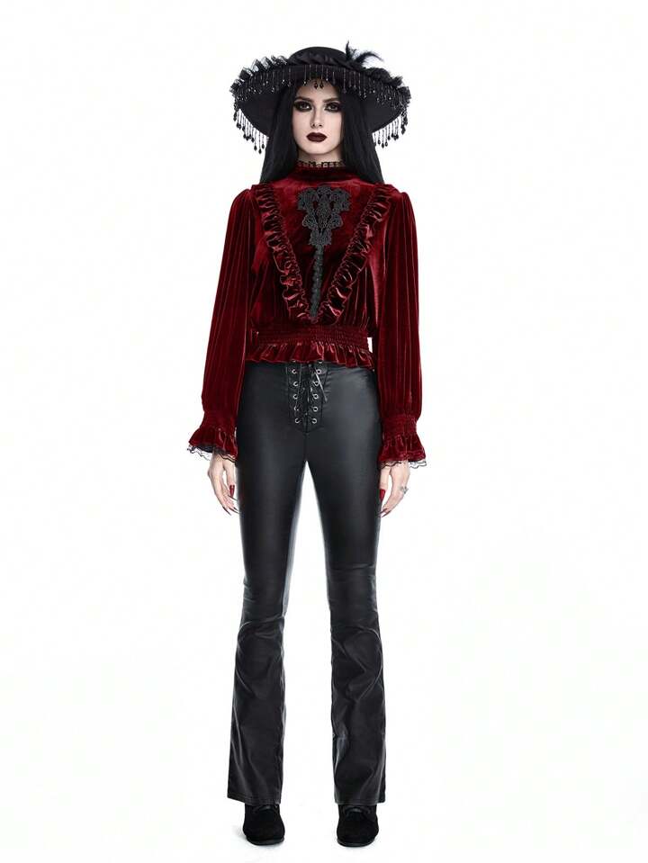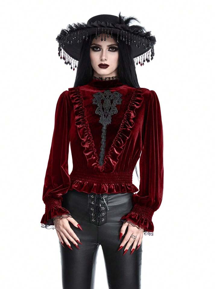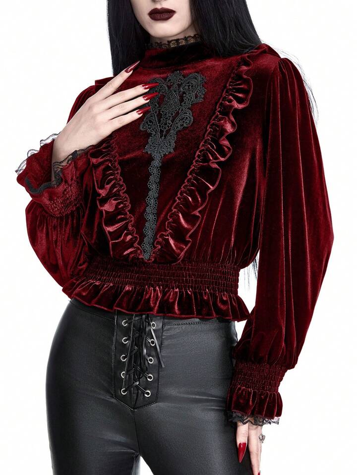 Goth Blusa in velluto da donna con maniche a lanterna, stile palazzo gotico da vampiro, con applicazioni ricamate