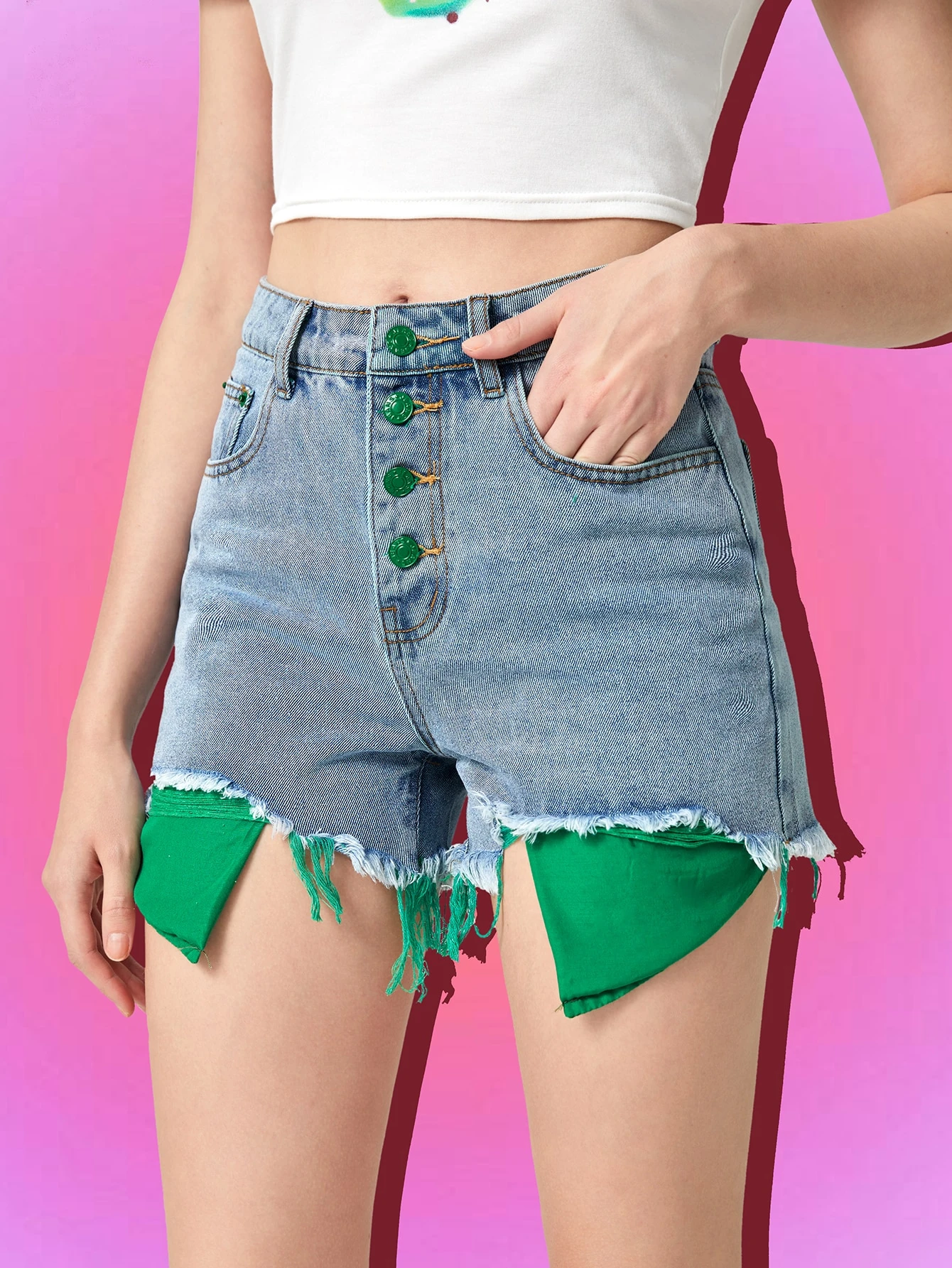 Shorts in denim color block orlo grezzo