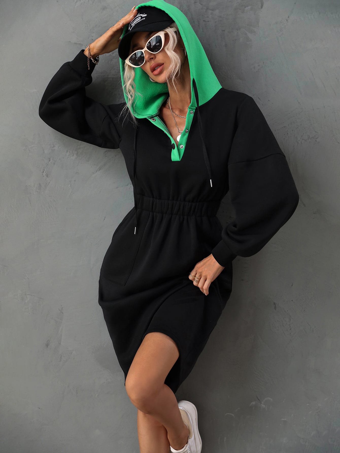 Abito con cappuccio color block con vita elastica tasca inclinata con coulisse