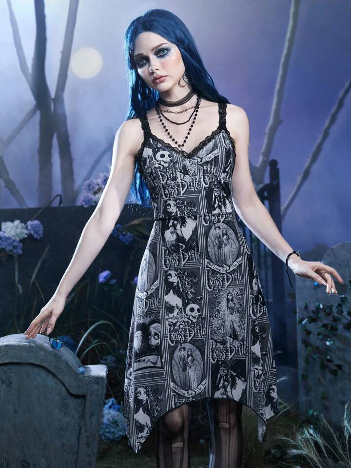 Corpse Bride | ROMWE Abito con bretelle sottile stampato all over con orlo asimmetrico